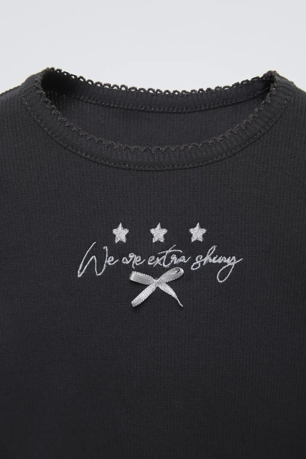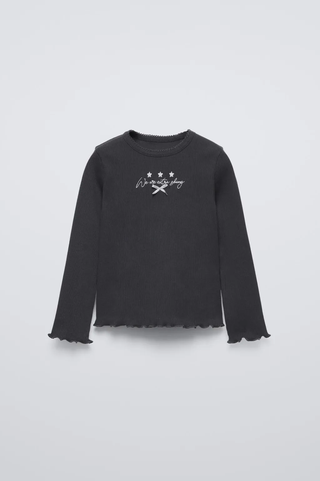 Camiseta rib con cuello redondo y manga larga. Acabados en volantes. Estampado texto bordado y aplique lacito en delantero.