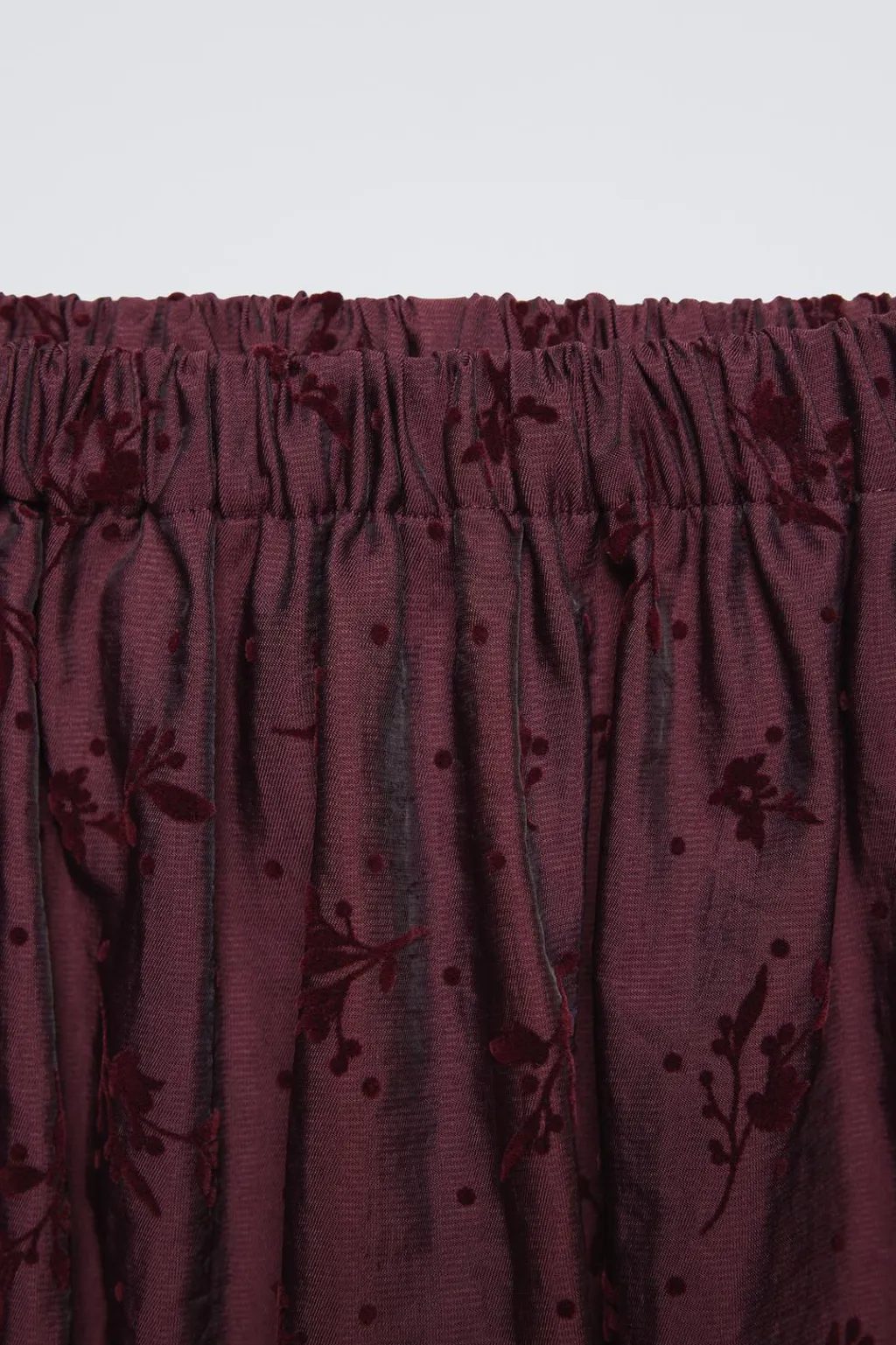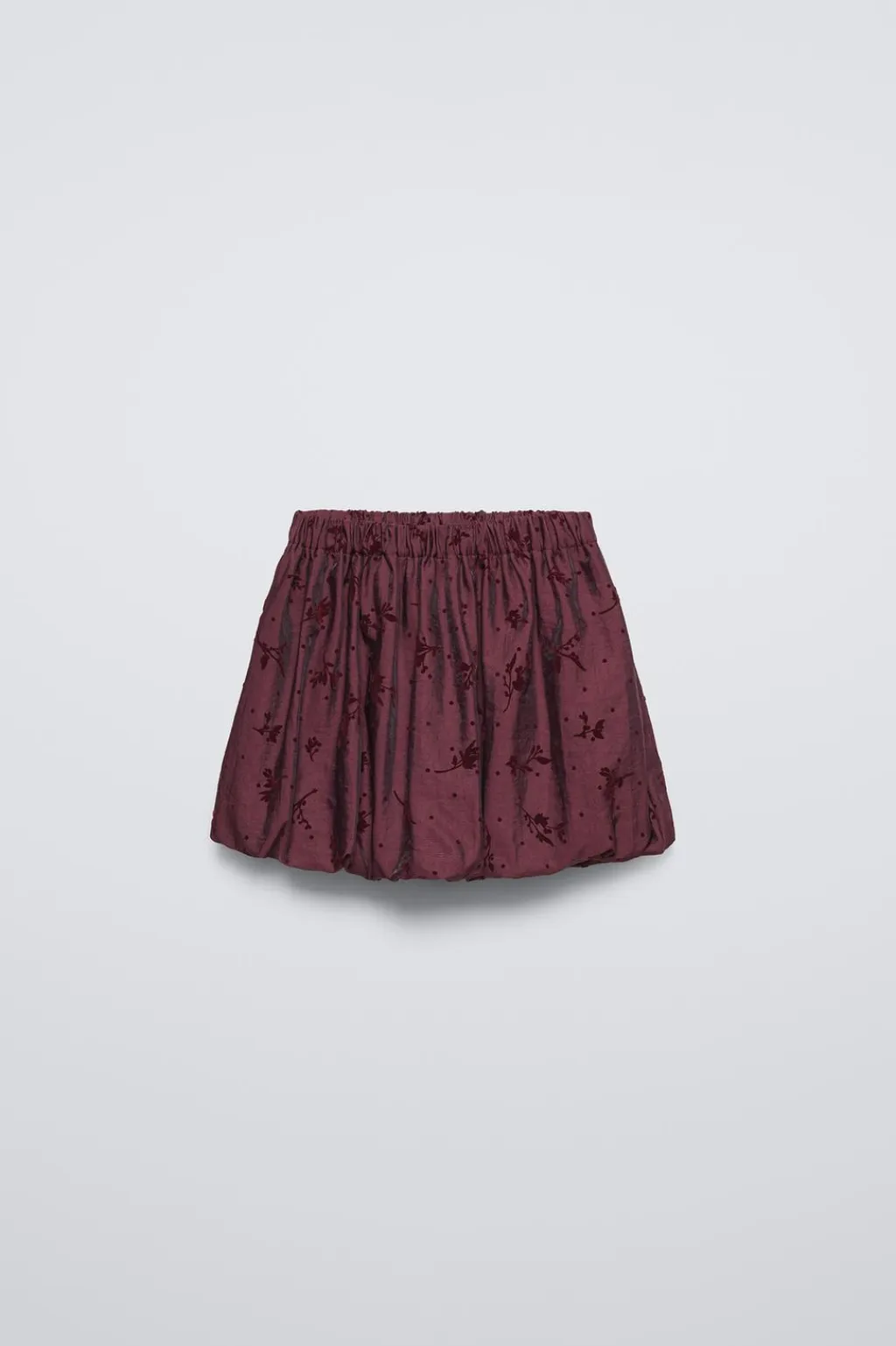Falda con cinturilla elástica. Detalle flores bordadas con flock. Bajo acabado en globo.