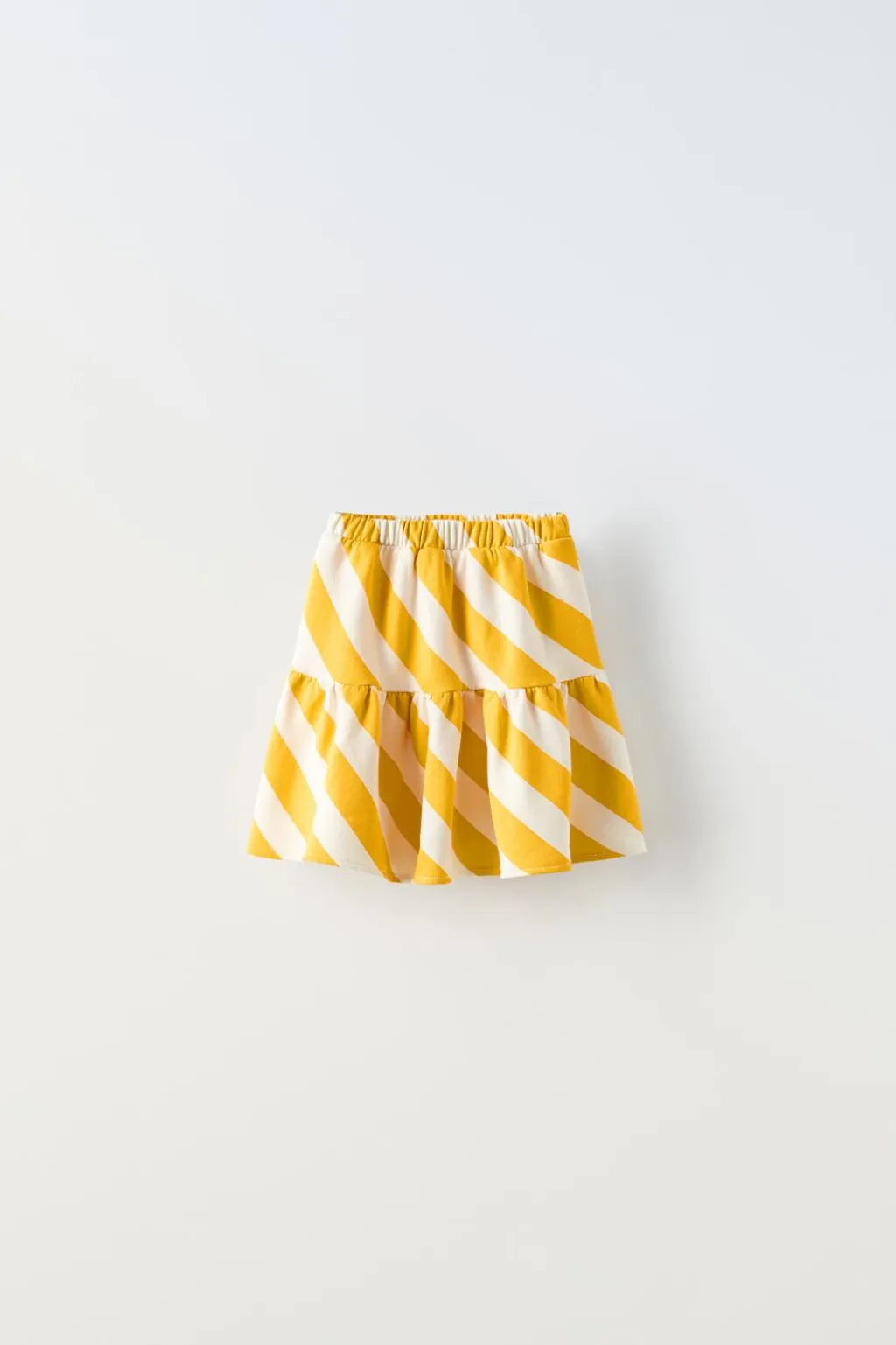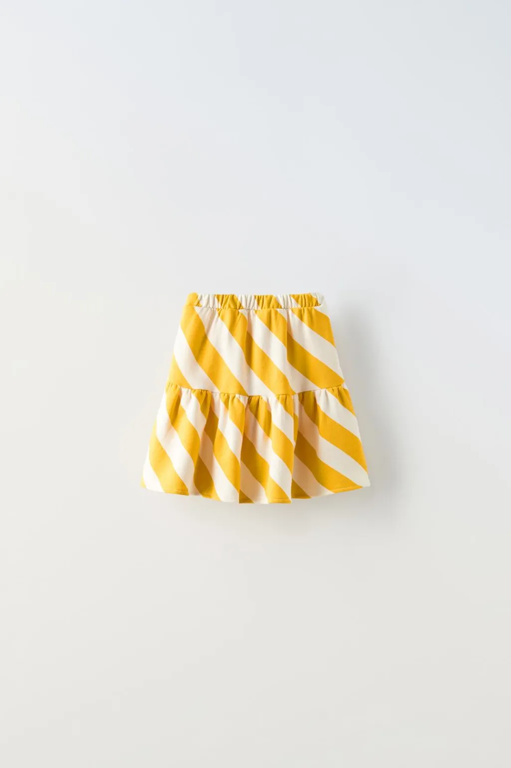 Falda con cinturilla elástica. Estampado de rayas all over. Detalle volante.