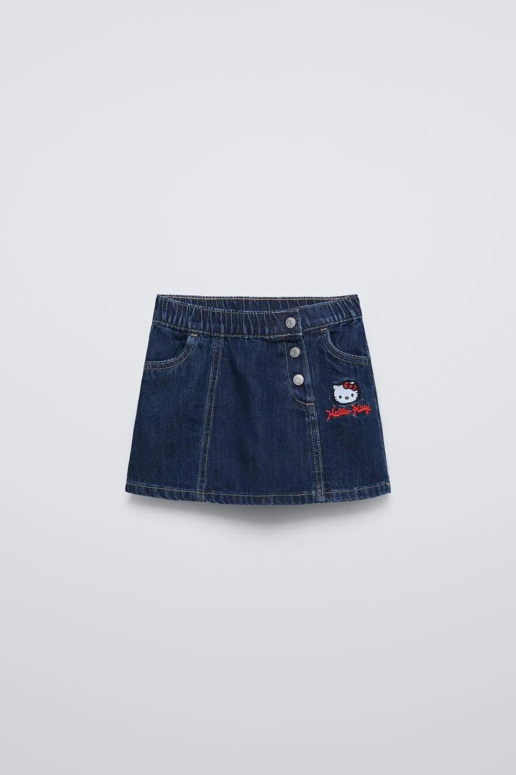 Falda con cinturilla elástica y cierre cruzado frontal de botones presión. Bolsillos delanteros. Detalle bordado HELLO KITTY © en delantero.