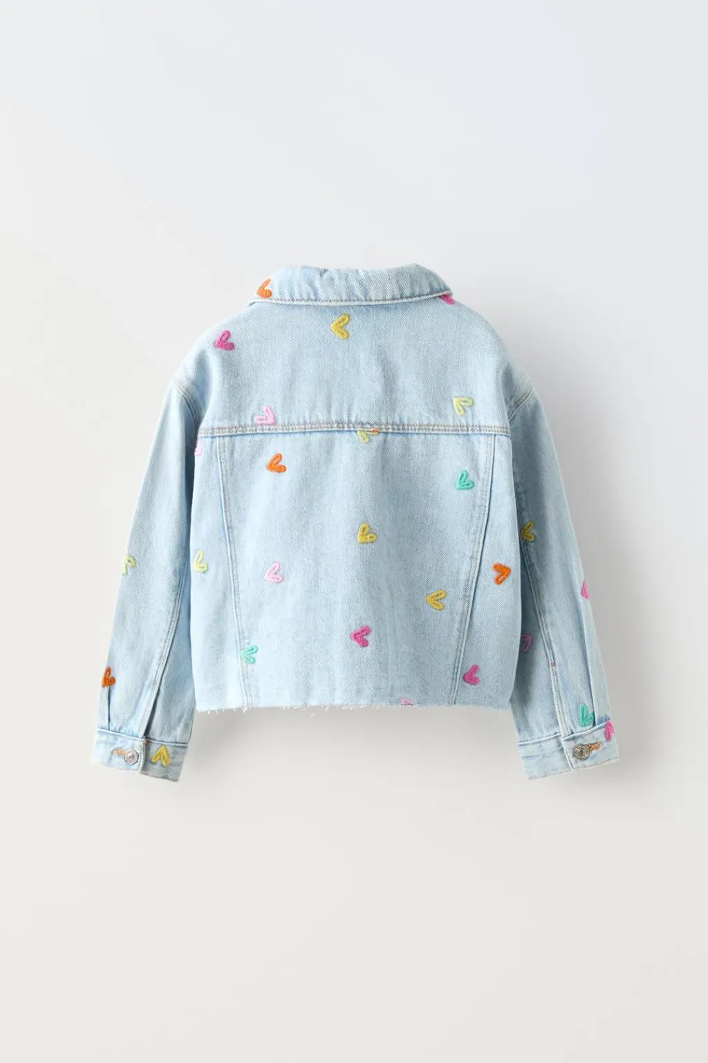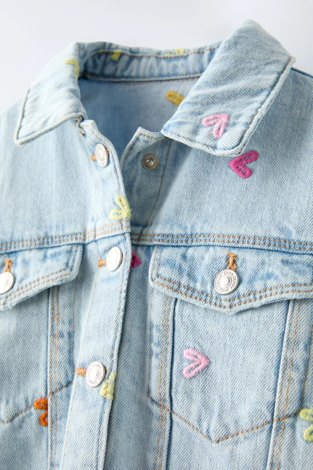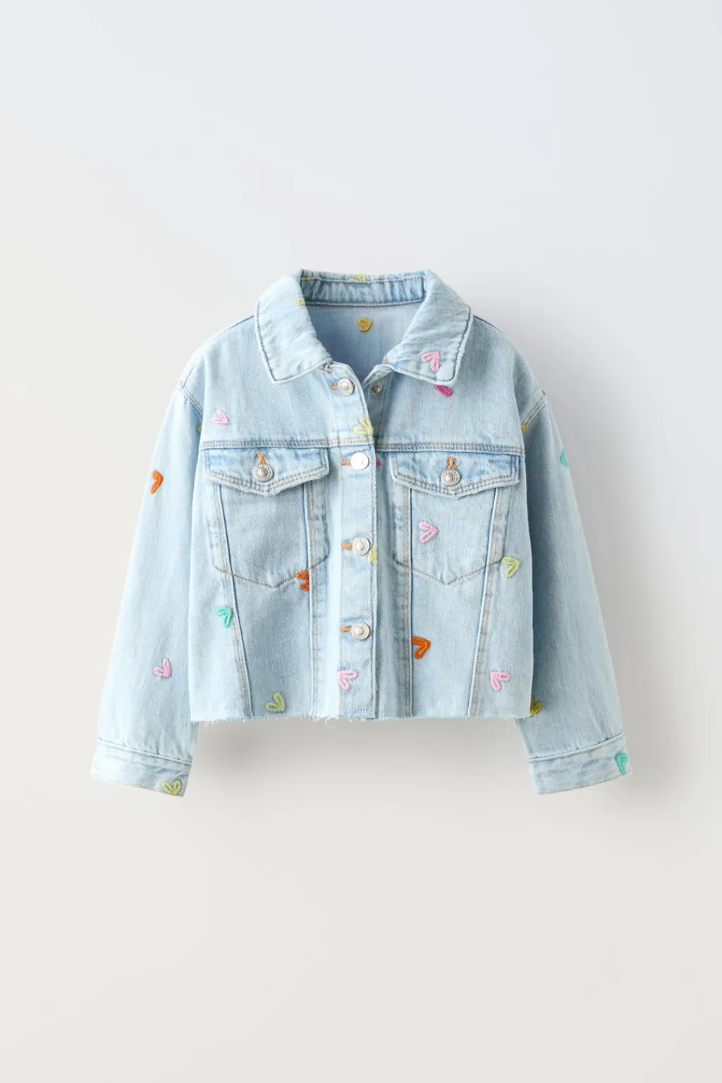 Cazadora con cuello tipo camisero y manga larga. Cierre botonadura frontal. Bolsillos de tipo plastrón con tapeta en pechera. Detalle bordados corazones.