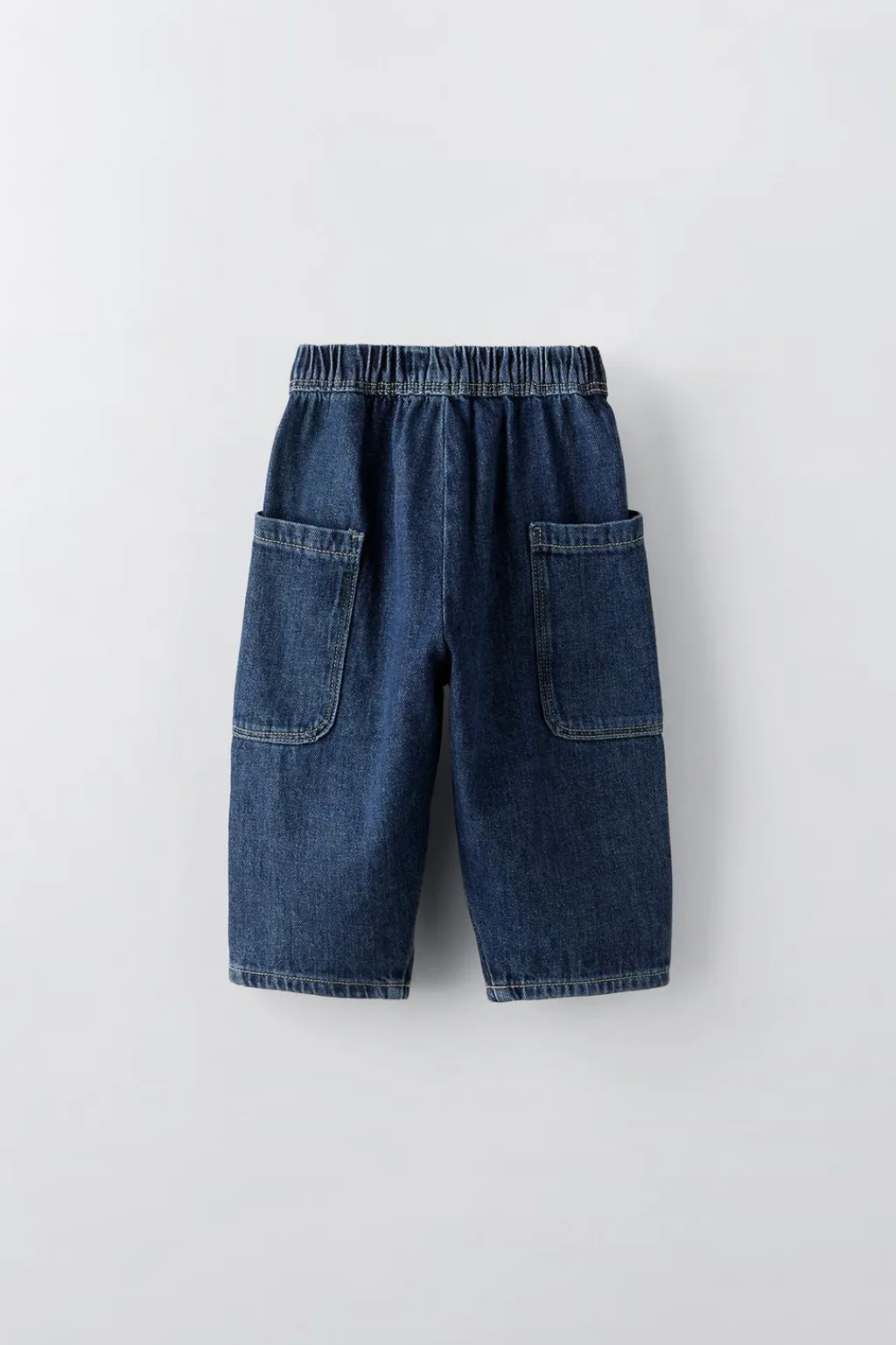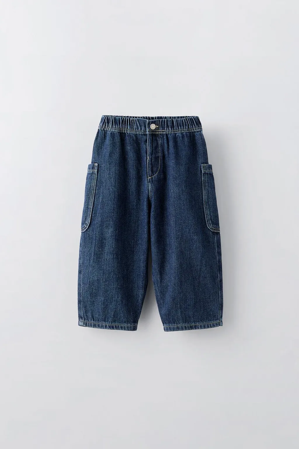 Jeans con cinturilla elástica y cierre botón frontal. Bolsillos de tipo plastrón en laterales.
