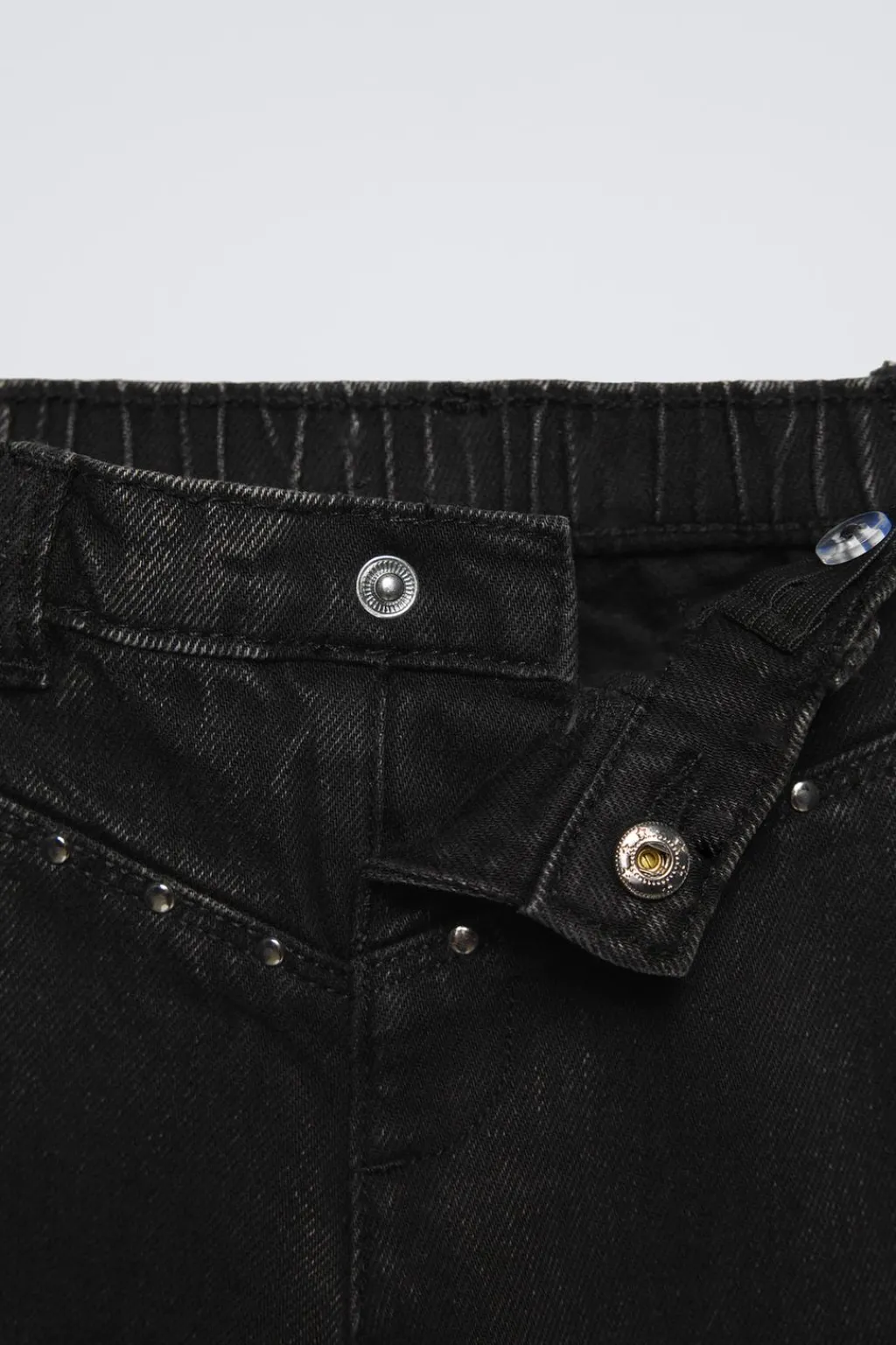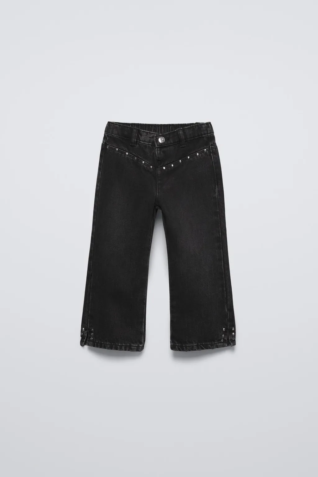 Jeans tipo flare con cinturilla interior ajustable y cierre botón presión frontal. Bolsillos de tipo plastrón en espalda. Aplique tachas en delantero. Bajo acabado en aberturas laterales.