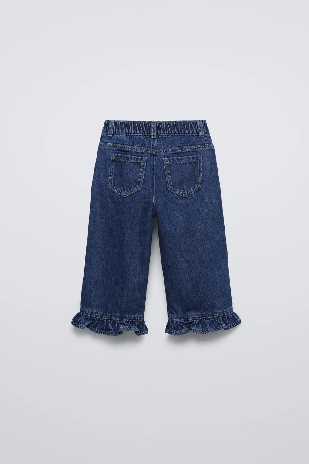 Jeans con cinturilla elástica y cierre botón tipo presión en delantero.Cierre con cremallera a partir de la talla 4. Bolsillos en delantero y de tipo plastrón en espalda. Detalle volantes en bajo.