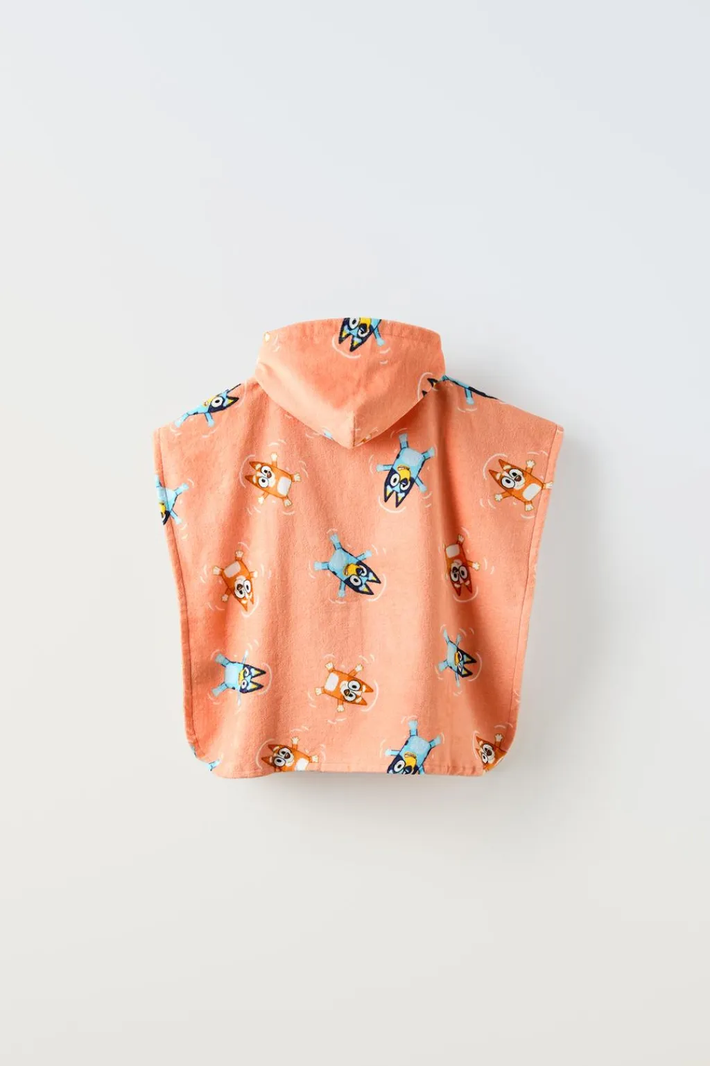 Poncho tipo toalla con capucha. Estampado BLUEY © LUDO STUDIO y aplique etiqueta engomada en bajo.