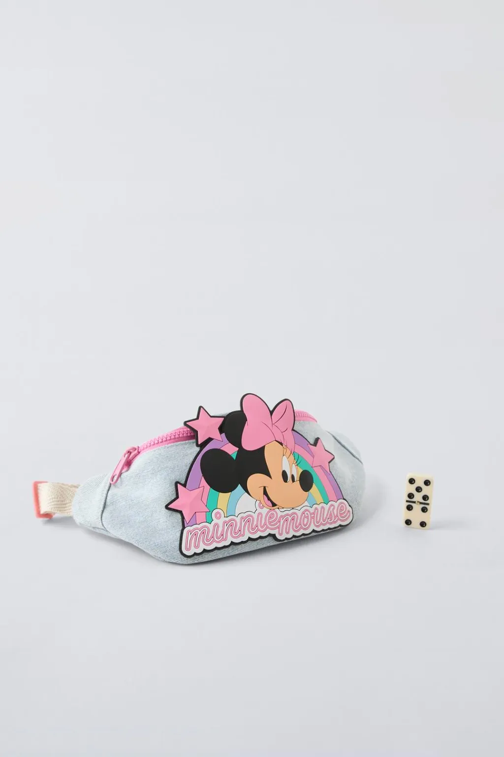 Bolso formato riñonera denim MINNIE MOUSE © DISNEY. Compartimento principal con cierre mediante cremallera. Asa ajustable con cierre mediante clip.