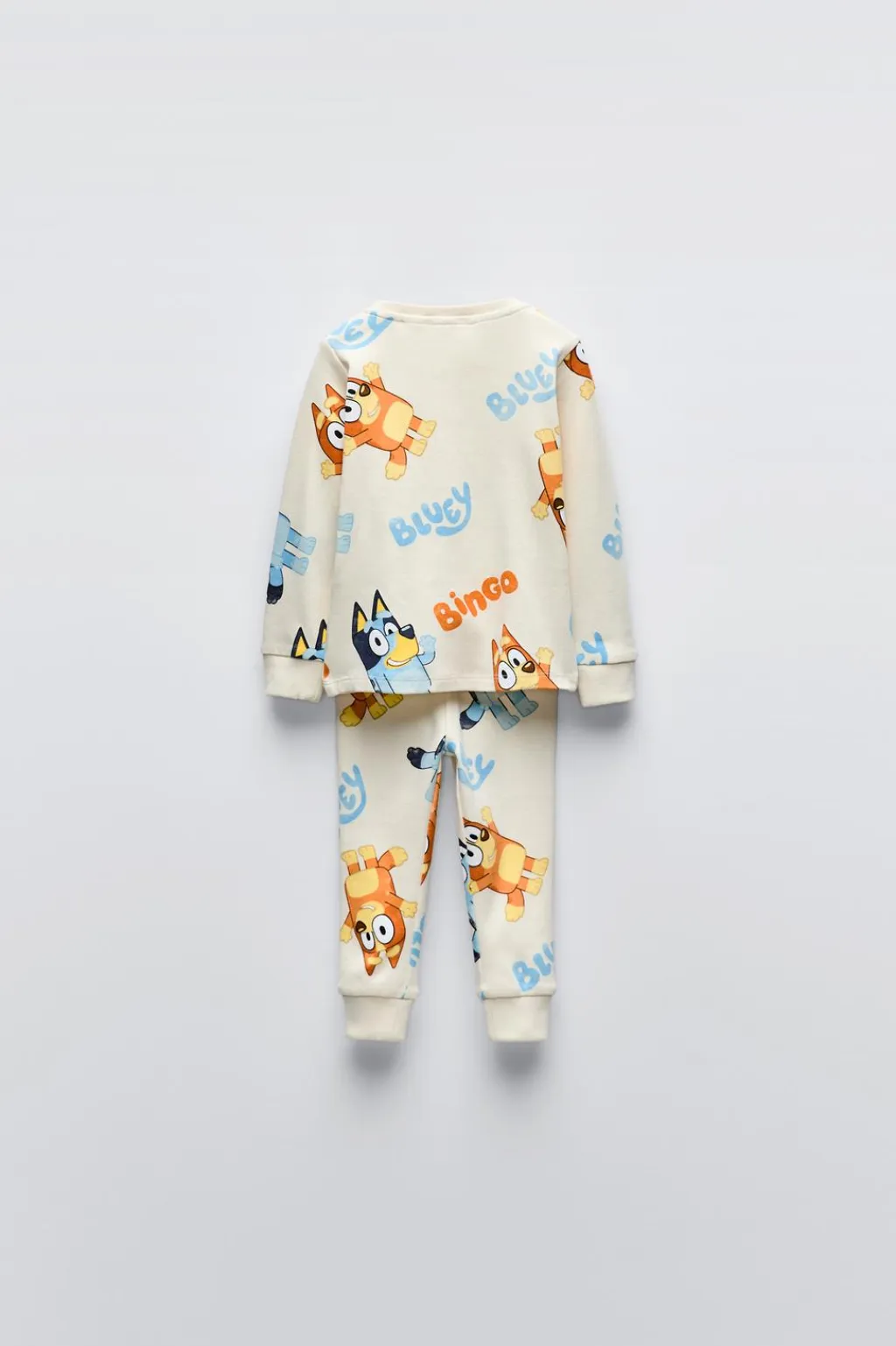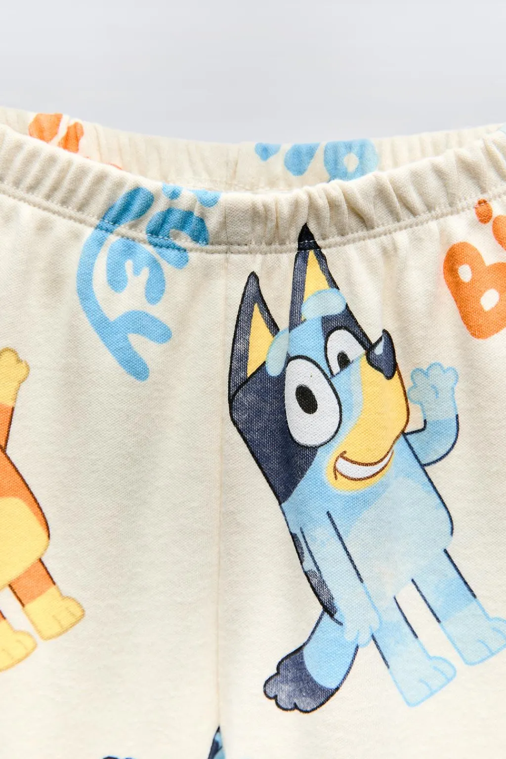 Pijama de dos piezas. Camiseta con cuello redondo y manga larga acabada en puño. Pantalón con cinturilla elástica y bajo acabado en puño. Estampado BLUEY © LUDO STUDIO.