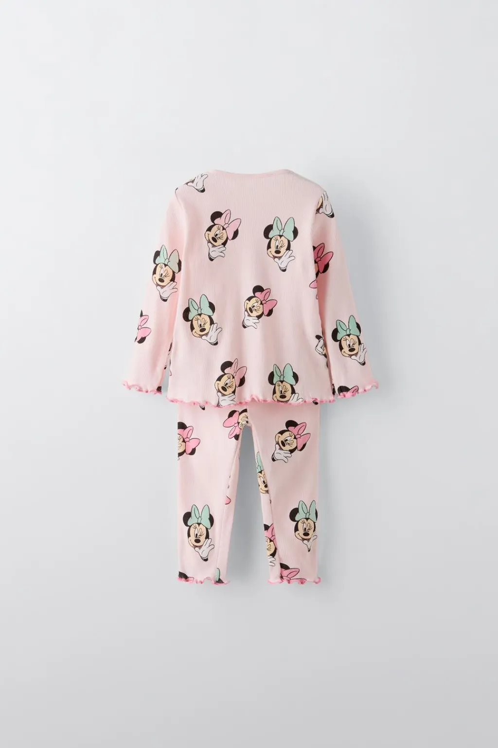 Pijama dos piezas. Camiseta con cuello redondo y manga larga. Pantalón con cinturilla elástica. Acabados en rizo. Estampado MINNIE MOUSE © DISNEY.