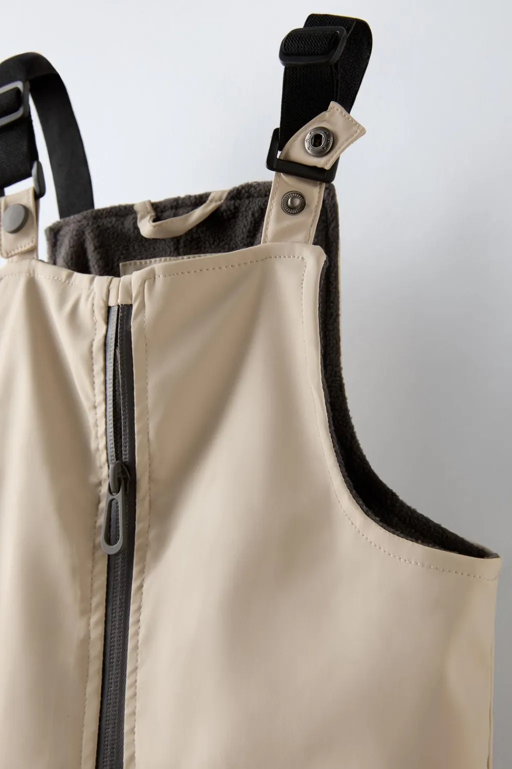 Peto con cuello recto y tirantes ajustables con botón tipo snap. Cierre con cremallera en delantero. Bajo acabado en goma y detalle bandas reflectantes. Forro interior calidad polar.