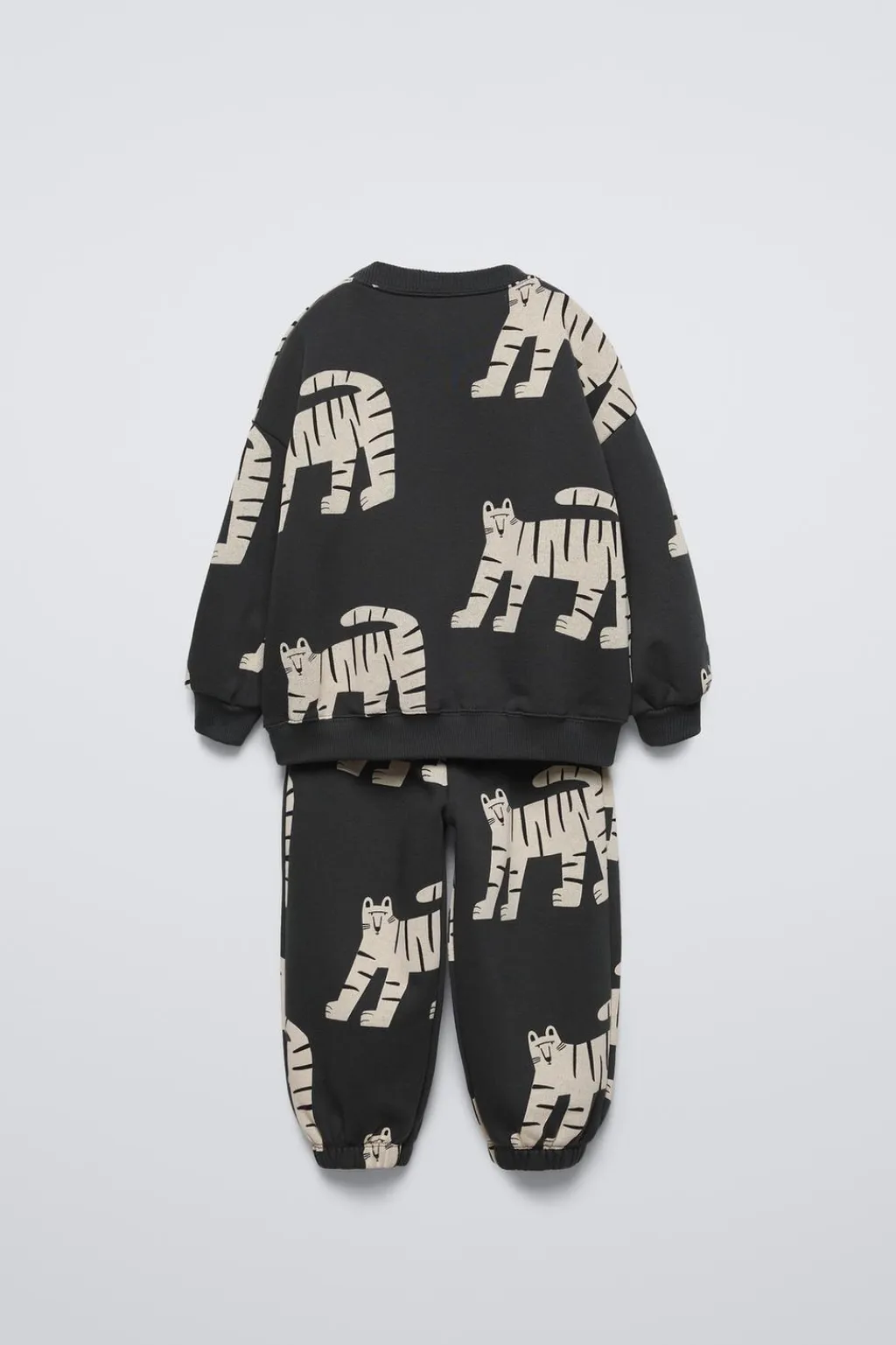 Conjunto de dos piezas. Sudadera con cuello redondo y manga larga. Acabados en rib. Pantalón jogger con cinturilla elástica. Bajo acabado en goma. Estampado tigres all over.