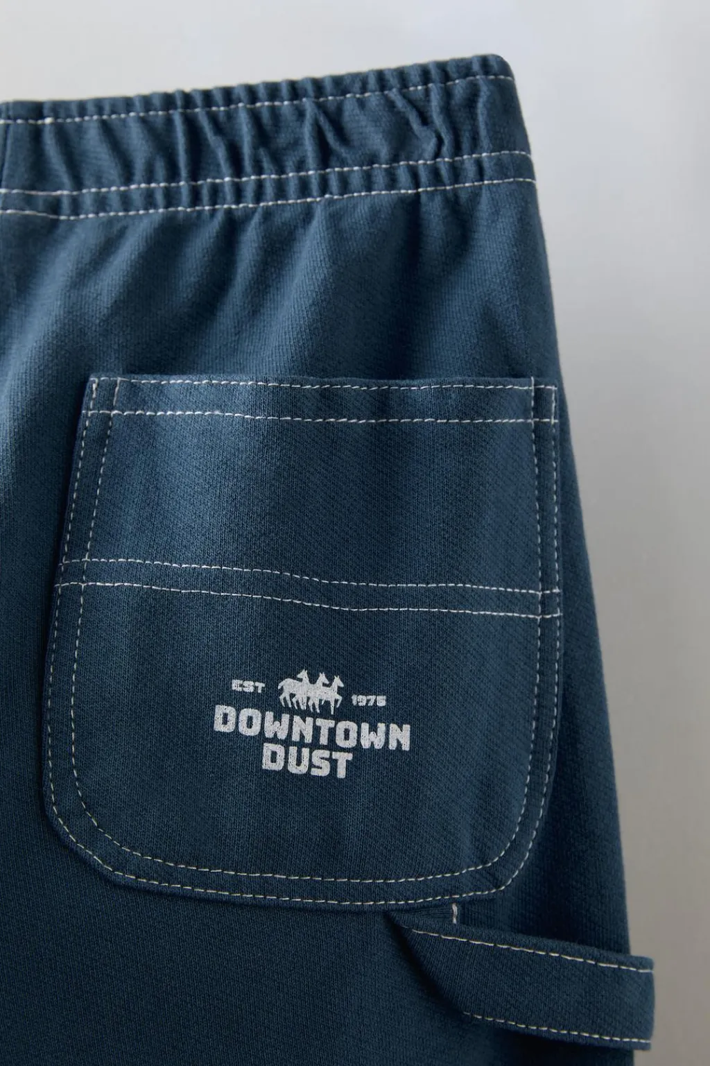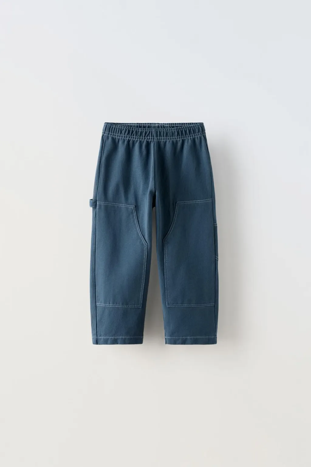 Pantalón con cinturilla elástica. Bolsillos de tipo plastrón en espalda. Detalle rodilleras en delantero y pespuntes en costuras.