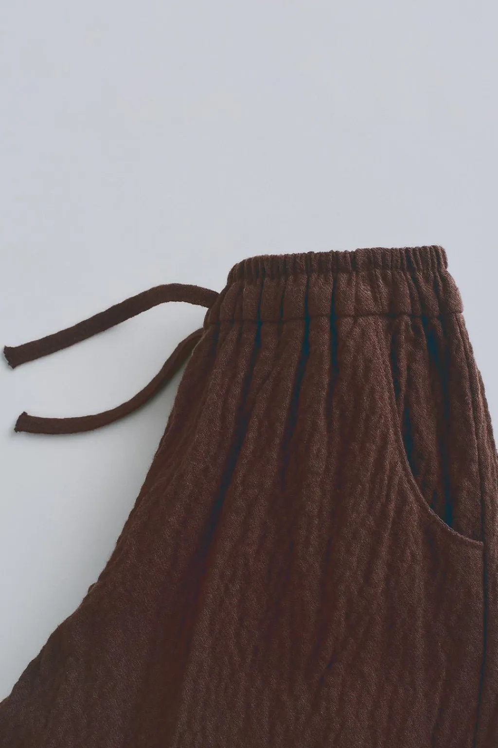 Pantalón confeccionado en tejido con textura y patrón ancho. Tiene la cinturilla elástica para dar comodidad con unos cordones decorativos. El bajo esta acabado con un vivo en el mismo tejido.