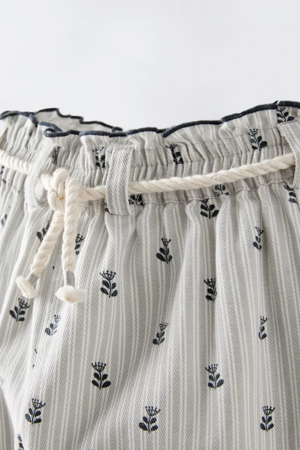 Pantalón con cinturilla elástica y aplique cordón en cinturilla. Detalle rizo con pespunte en color a contraste.