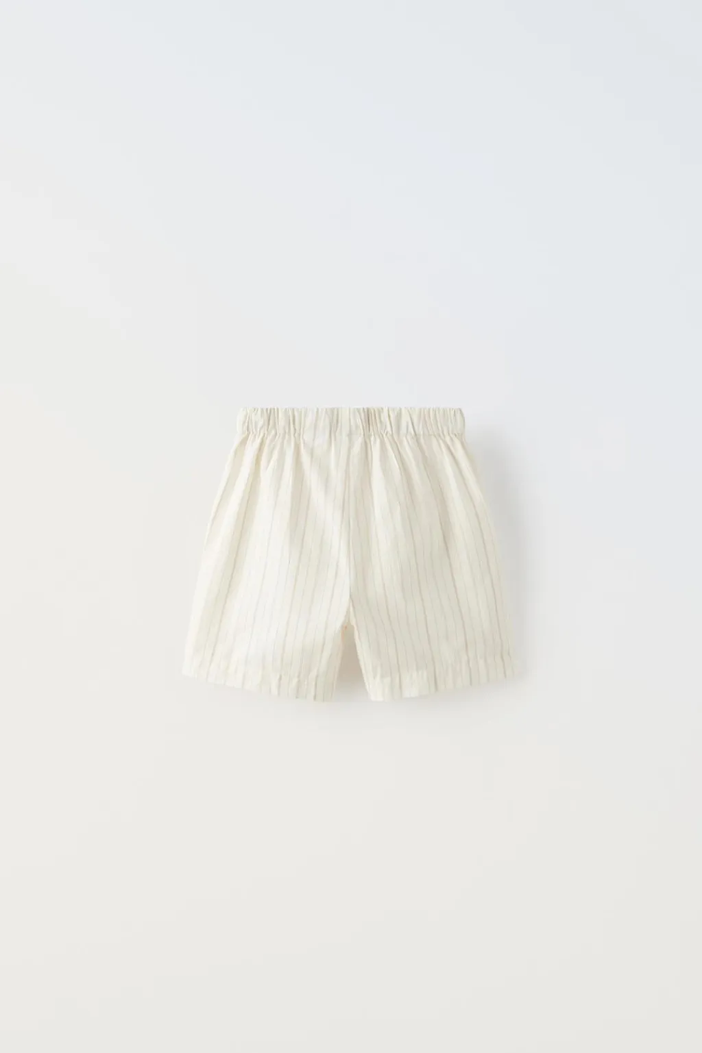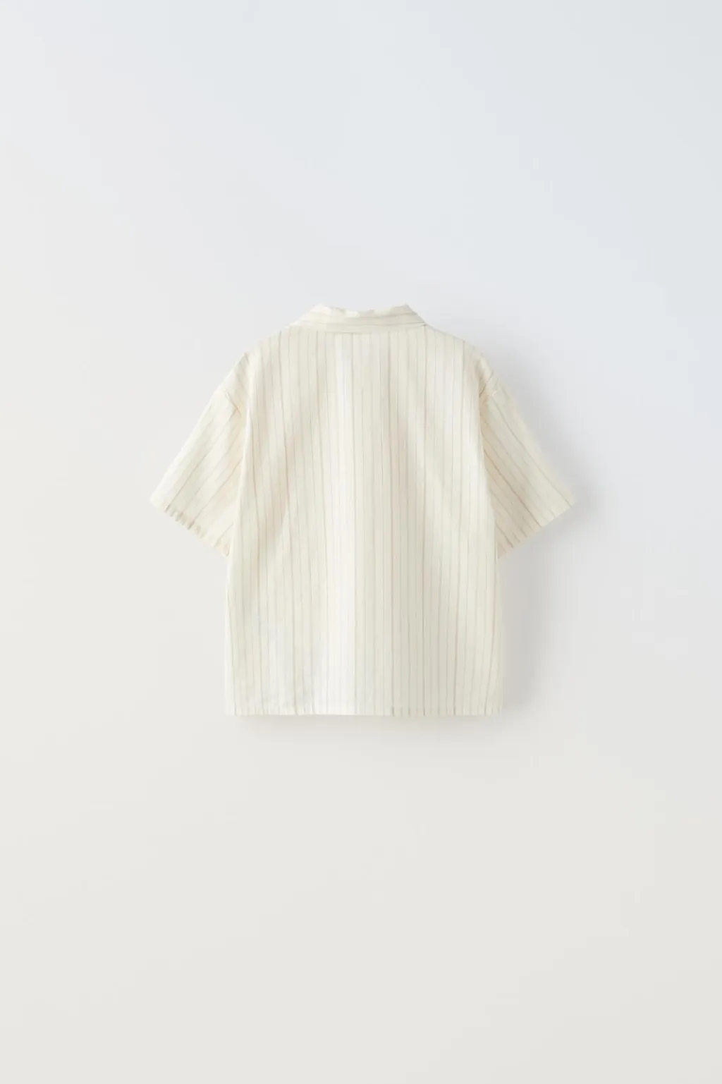 Pijama de dos piezas. Camisa con cuello bowling y manga corta. Cierre con botonadura frontal. Bolsillo tipo plastrón en pechera. Bermuda con cinturilla elástica y cordones ajustables.
