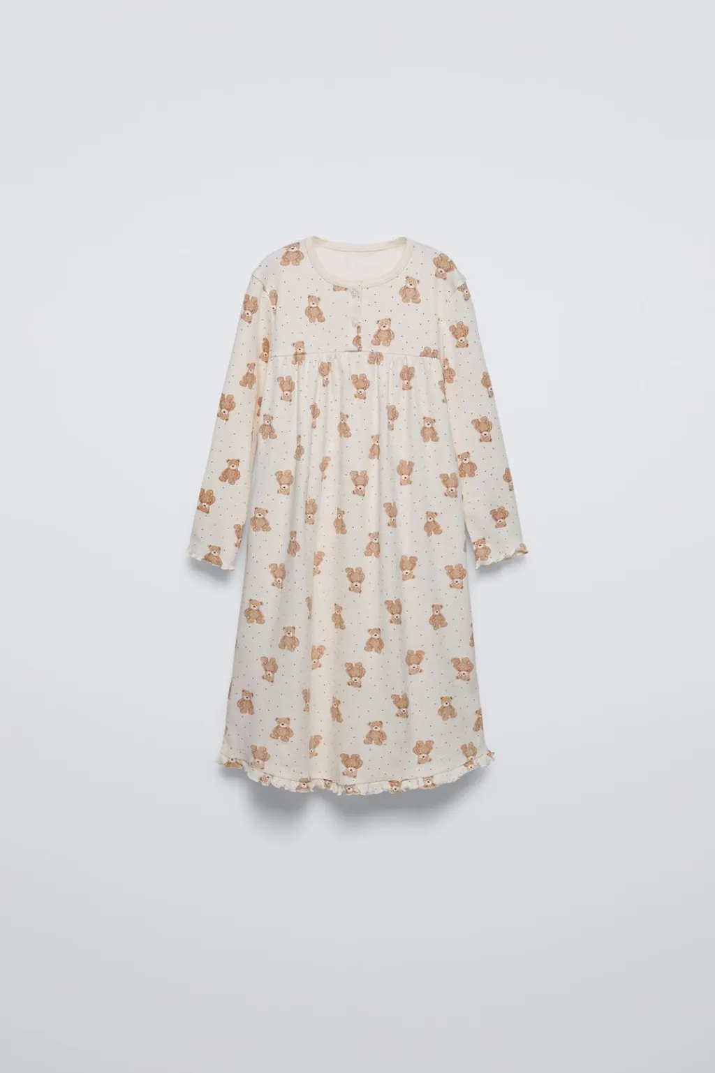 Camisón con cuello redondo y manga larga acabada en rizo. Cierre botonadura frontal en canesú. Bajo acabado en volantes.