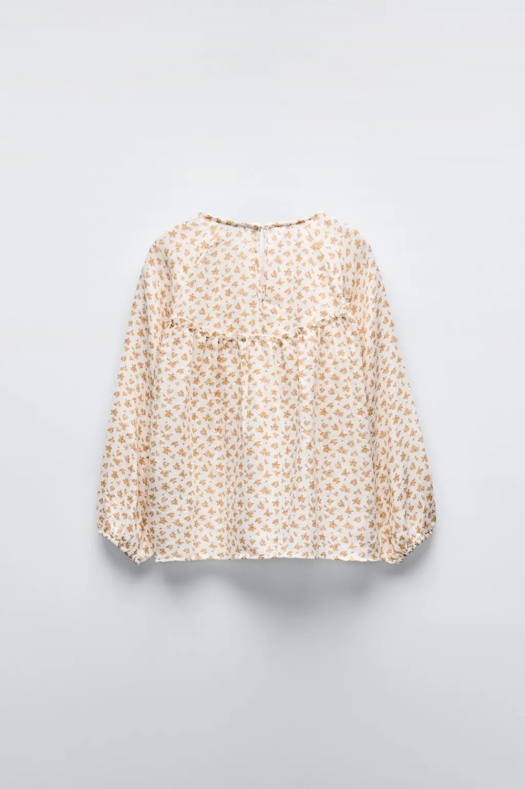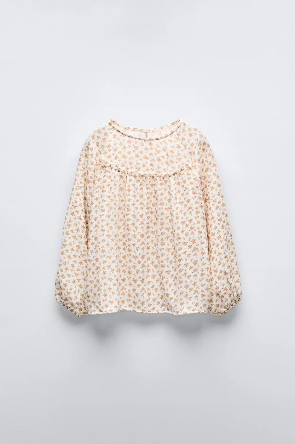 Pijama de dos piezas. Camiseta con cuello redondo y manga larga acabada en goma. Detalle volante en canesú. Cierre tipo lágrima con botón en espalda. Pantalón con cinturilla elástica y bajo acabado en goma.