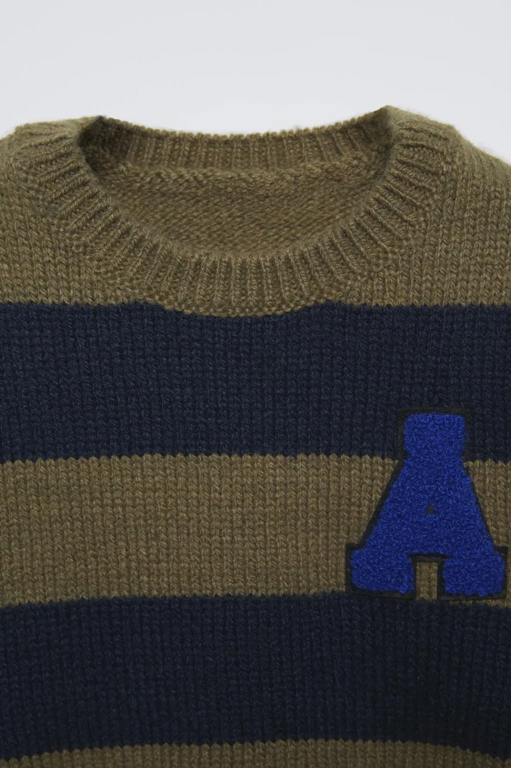 Jersey de punto con cuello redondo y manga larga. Estampado rayas y detalle parche rizo en pechera.