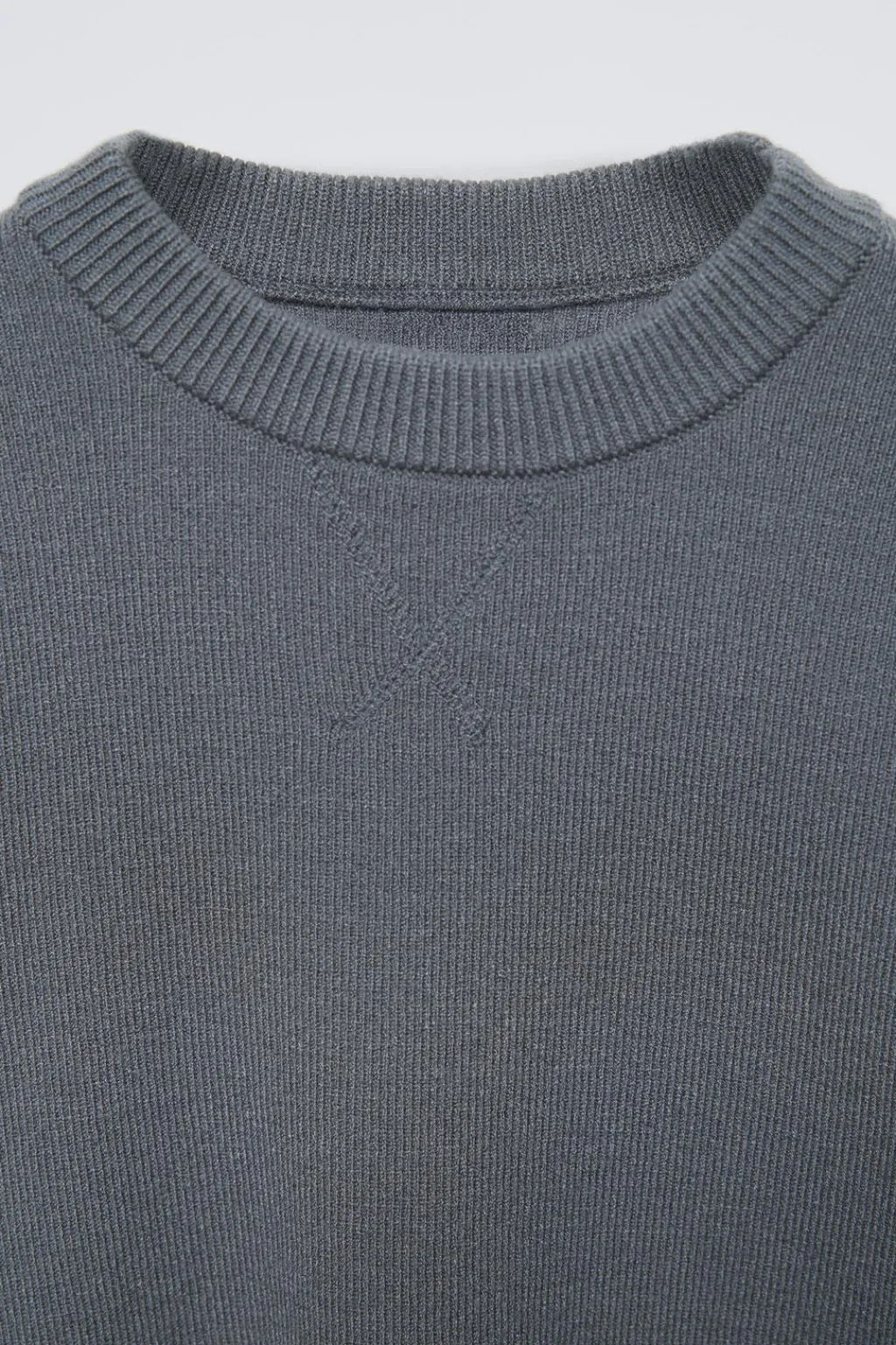 Jersey de punto liso con cuello redondo y manga larga. Acabados en rib.