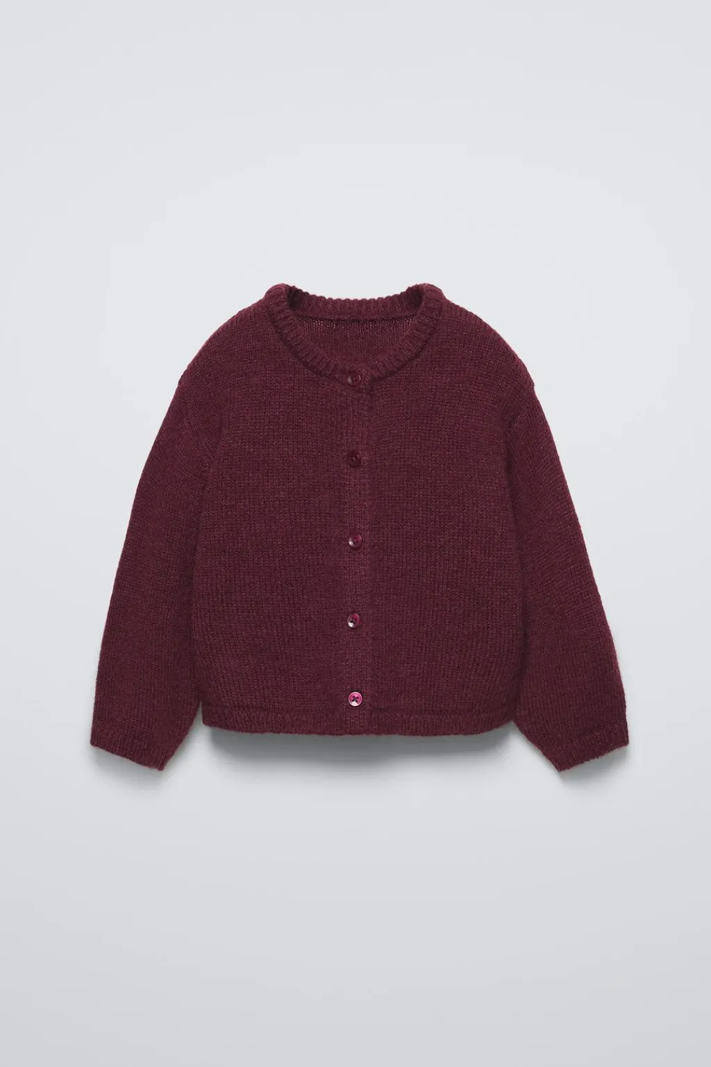 Chaqueta de punto con cuello redondo y manga larga. Cierre botonadura frontal. Tejido con un 10% lana.