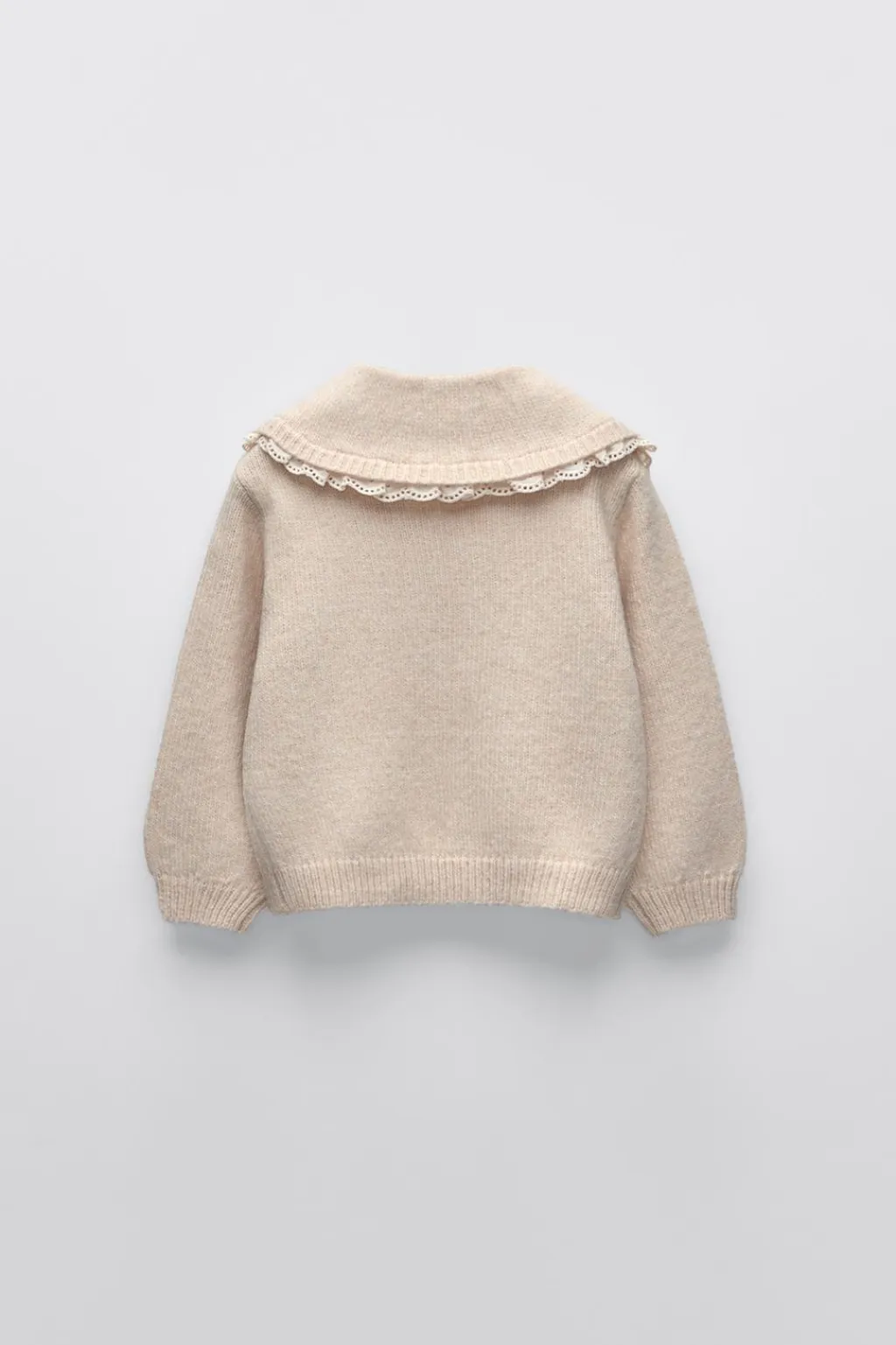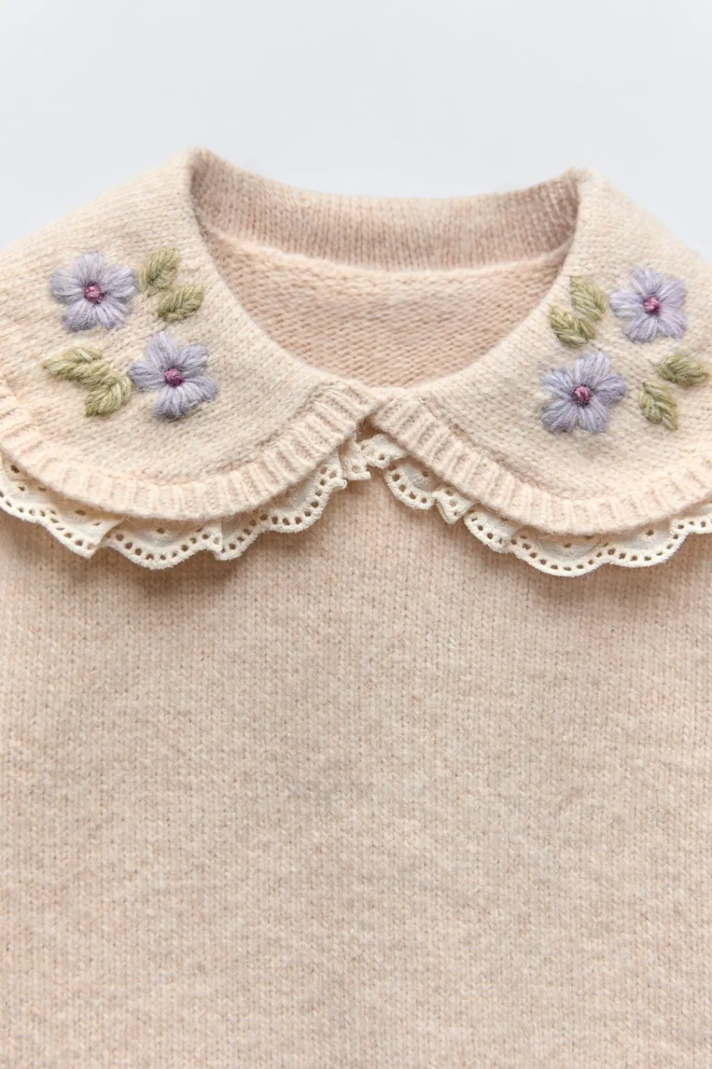 Jersey con cuello babero acabado en puntilla y manga larga. Detalle bordados.