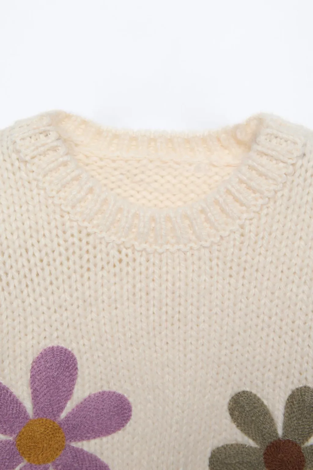 Jersey con cuello redondo y manga larga. Detalle flores bordadas en delantero y mangas.