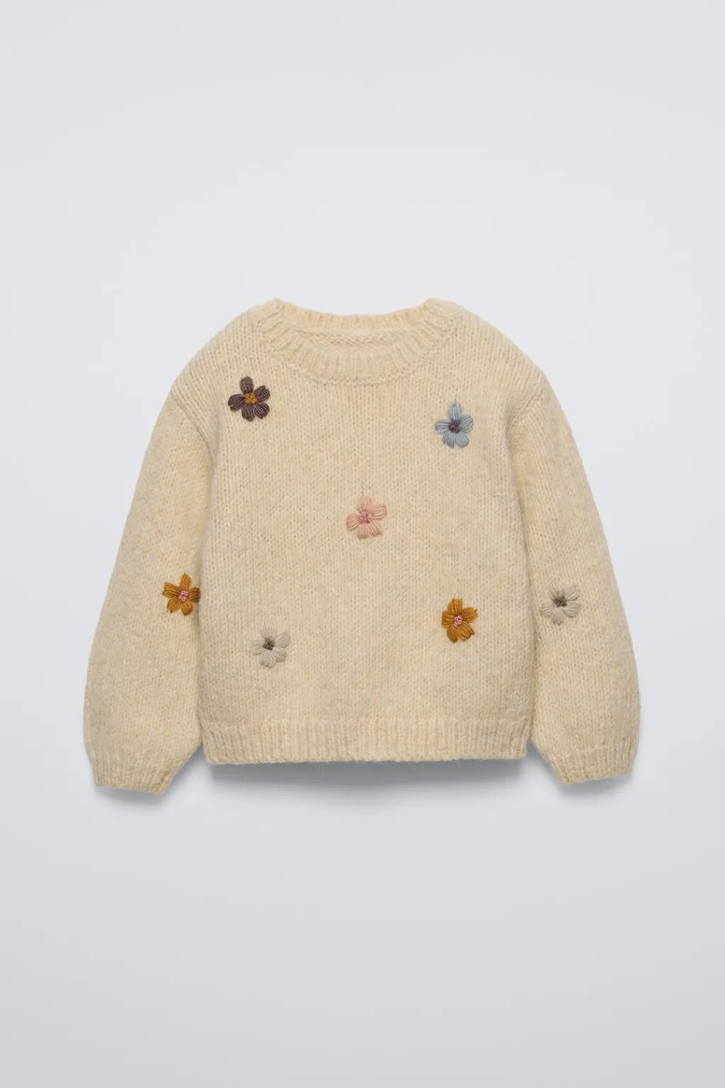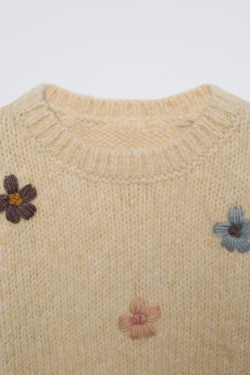 Jersey con cuello redondo y manga larga. Detalle flores bordadas en delantero.