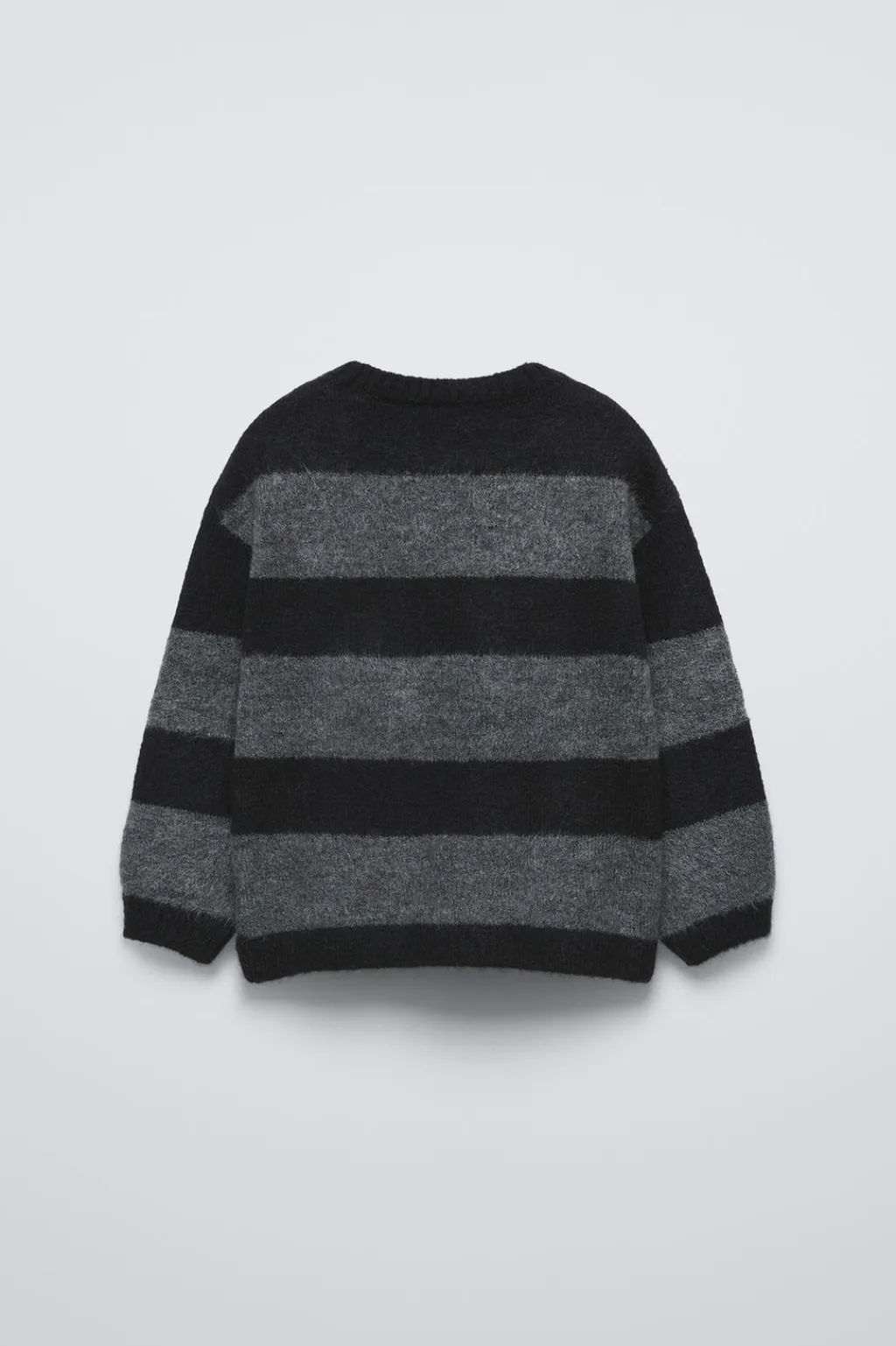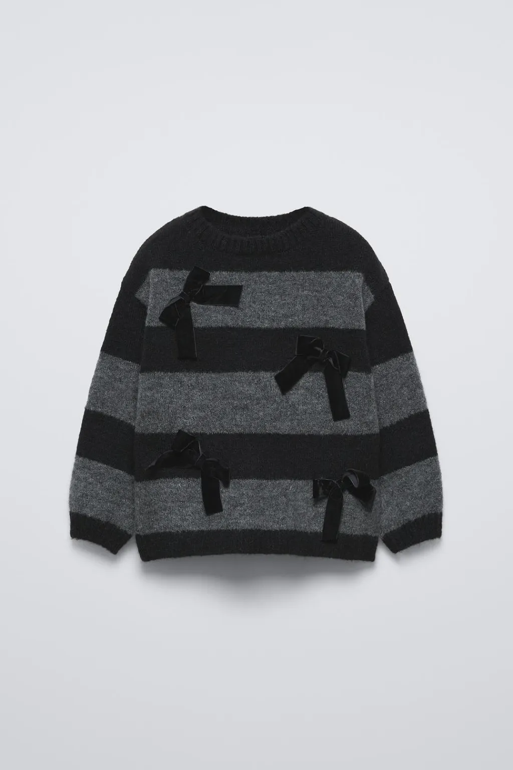 Jersey de punto con cuello redondo y manga larga. Estampado rayas y aplique lazos velvet en delantero.