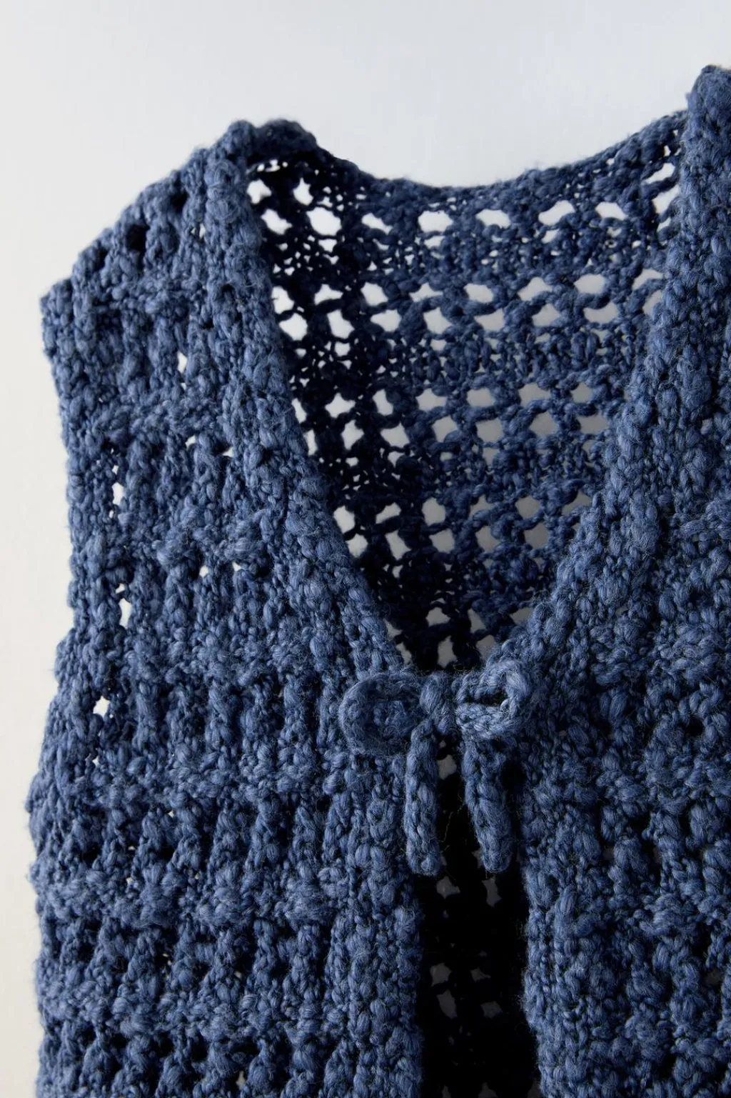Chaleco con cuello redondo y manga sisa. Cierre con lazada frontal.