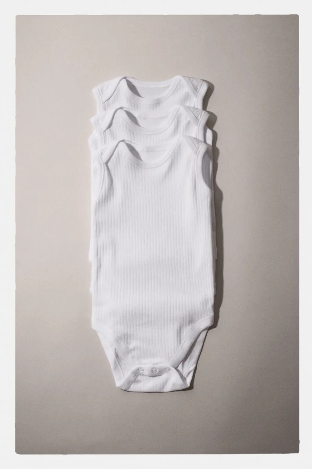 Pack de tres bodies con cuello redondo y manga sisa. Cierre botones presión en bajo.