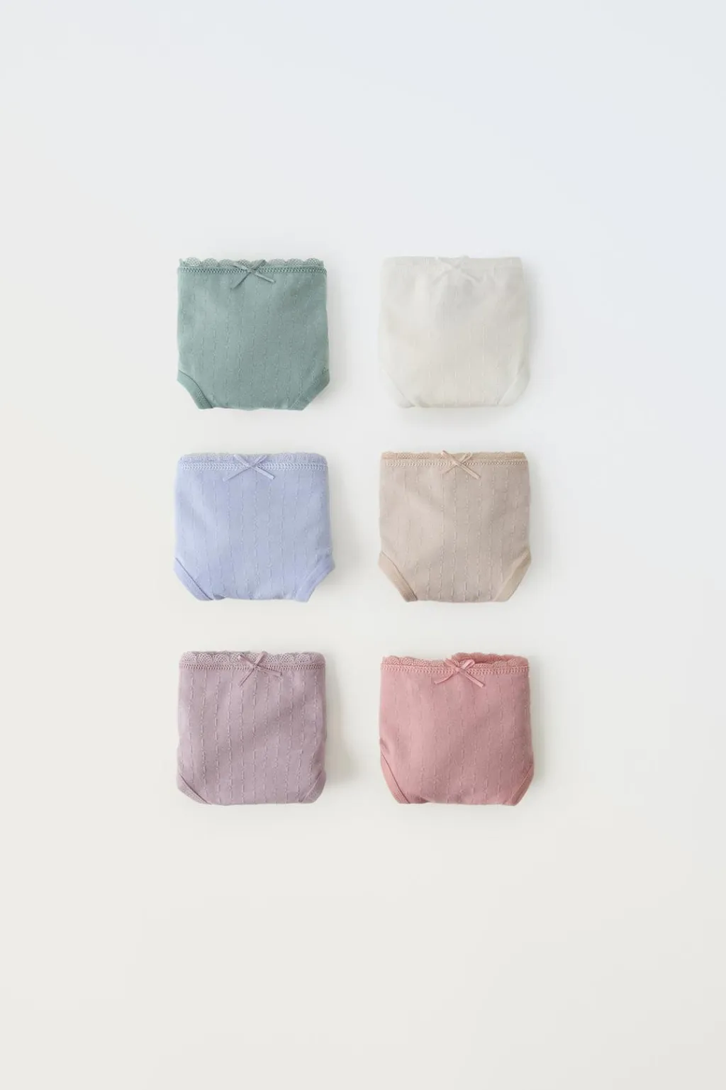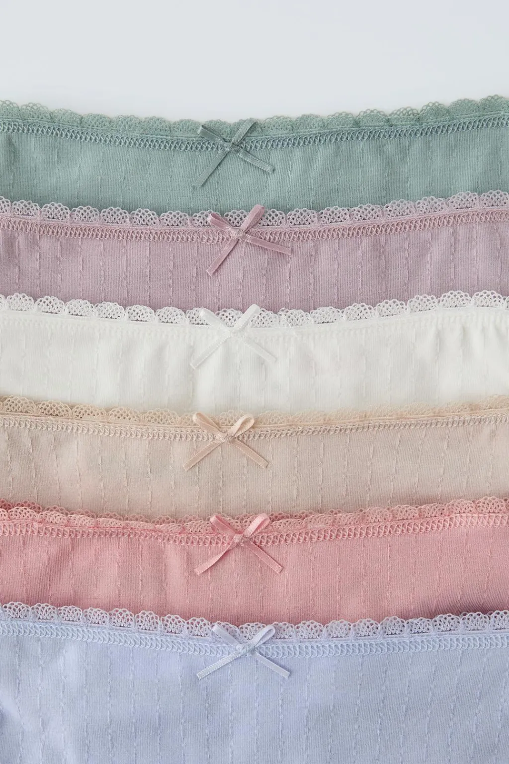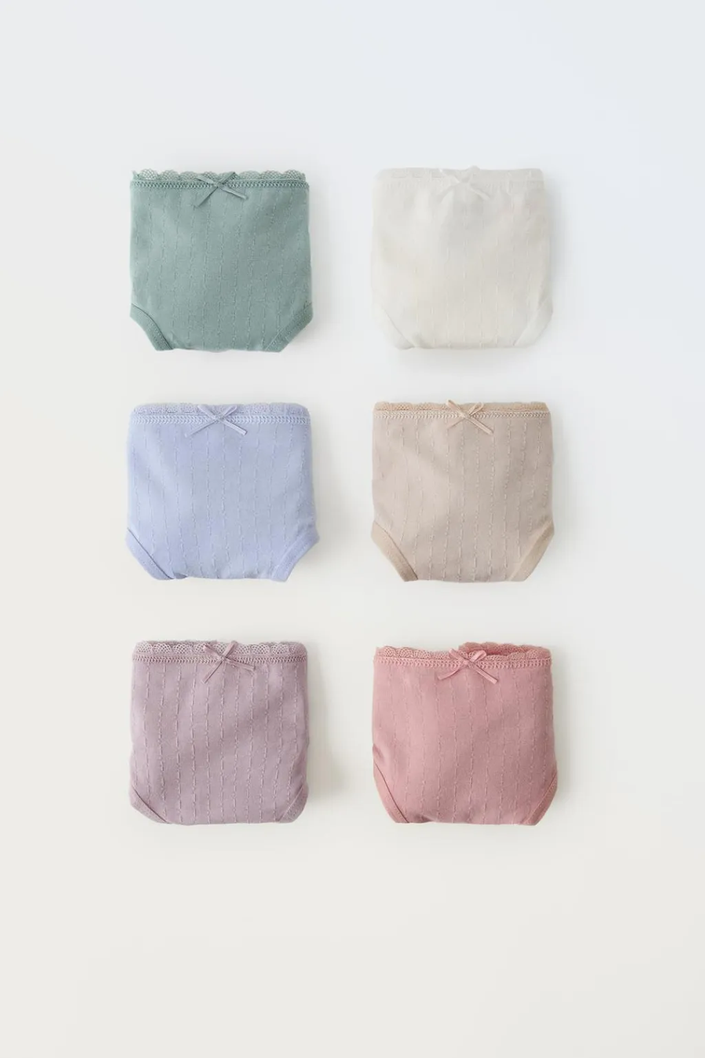 Pack de seis braguitas con cinturilla elástica y aplique lazos frontal.