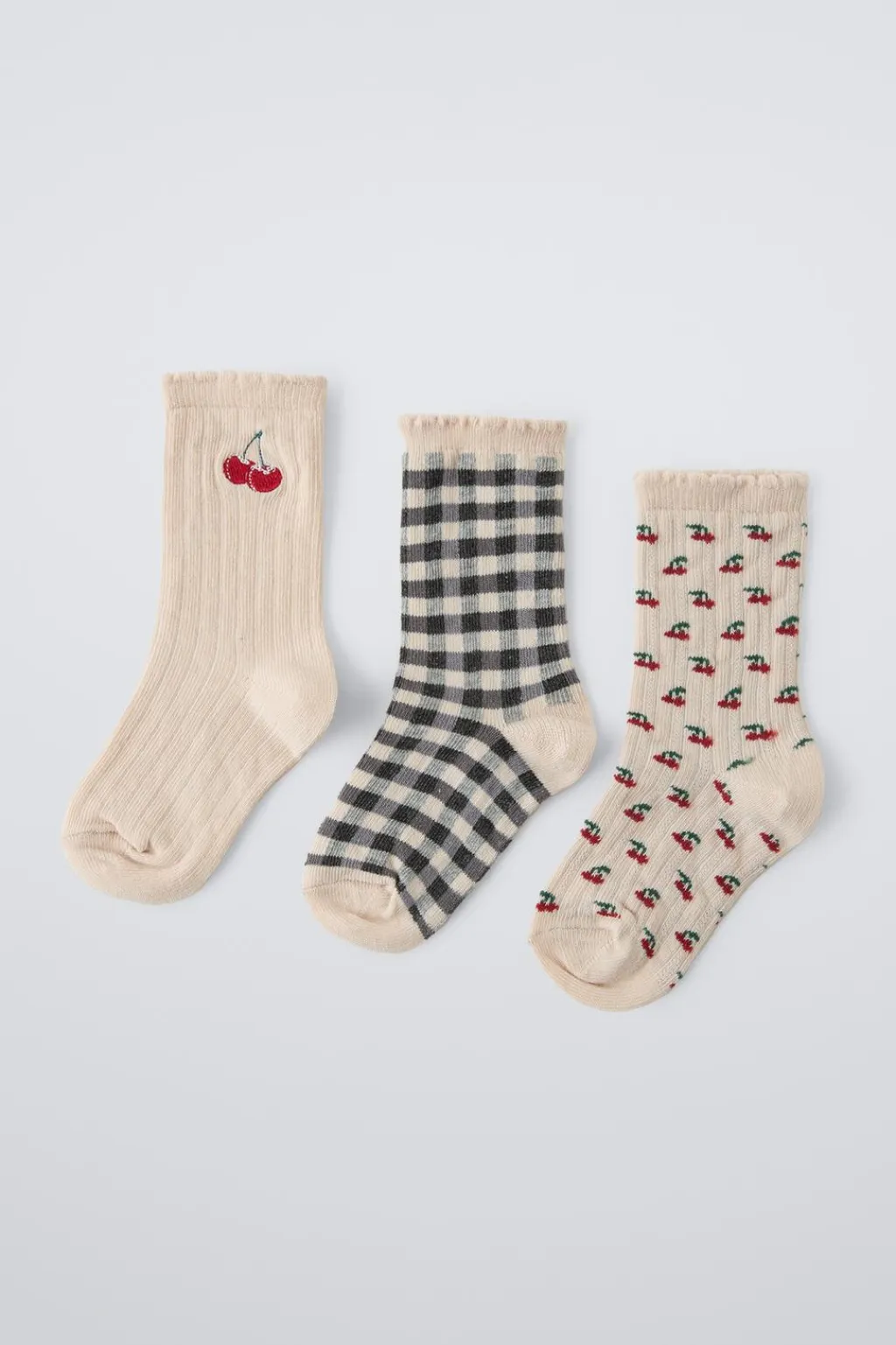 Pack de tres calcetines. Diferentes estampados de cerezas y cuadros.