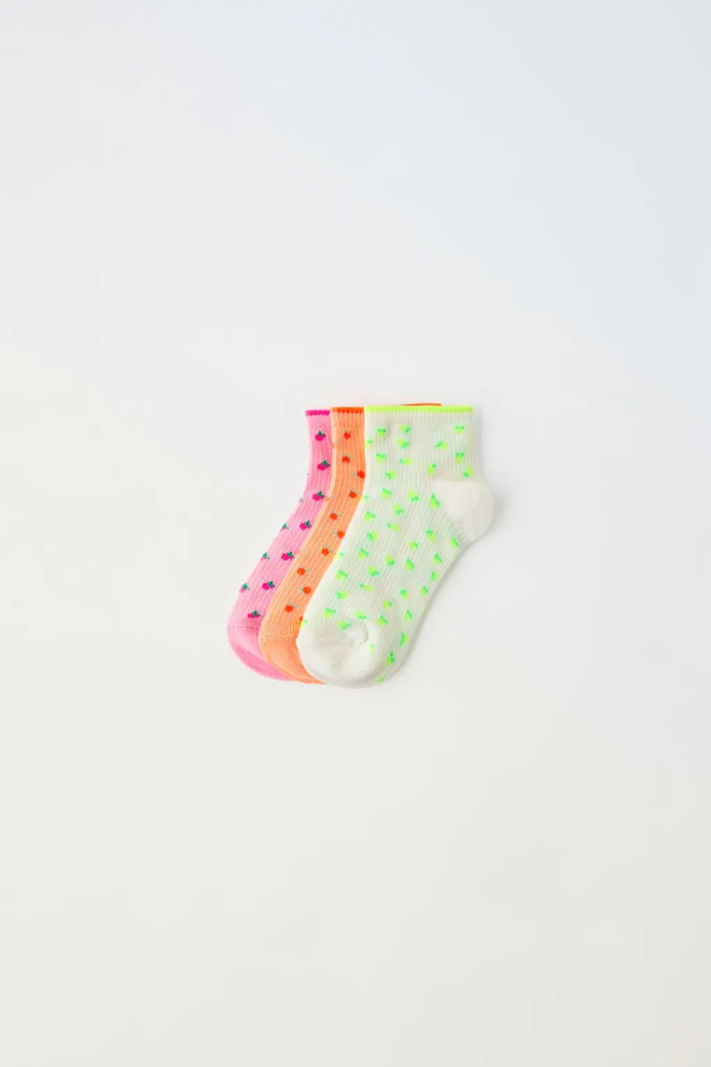 Pack de tres calcetines cortos con estampado frutitas y detalle flúor.