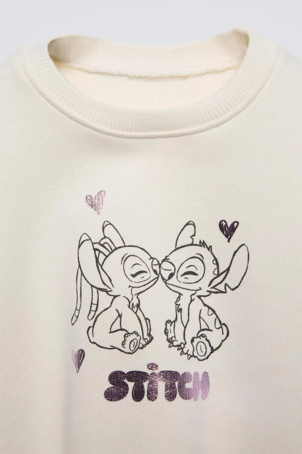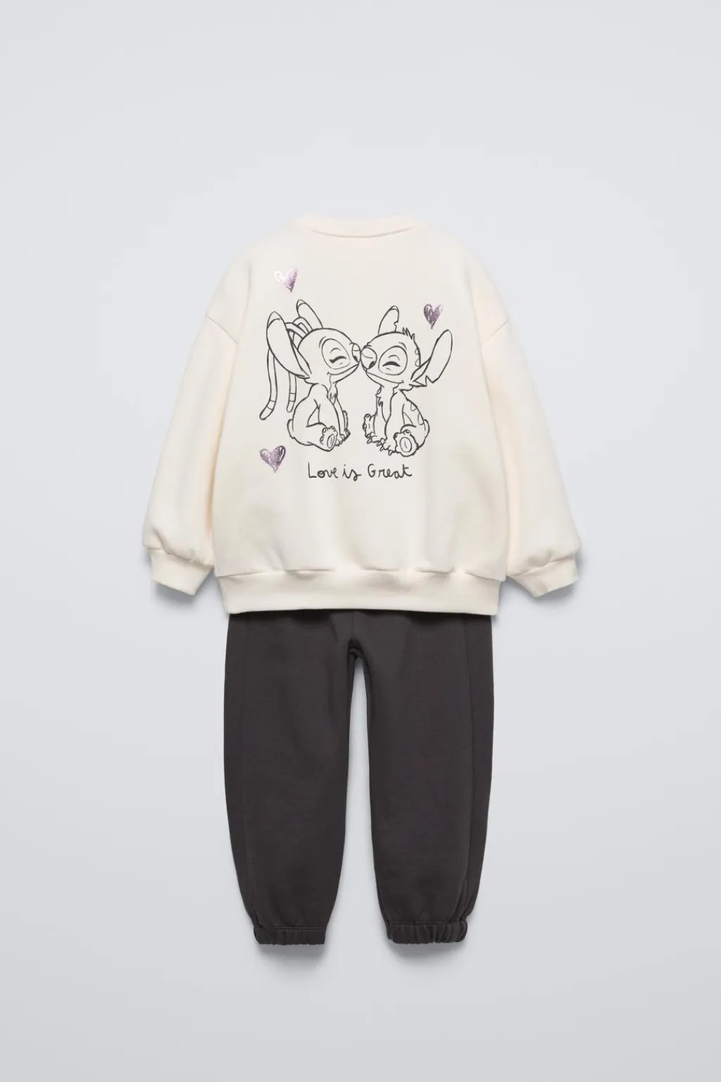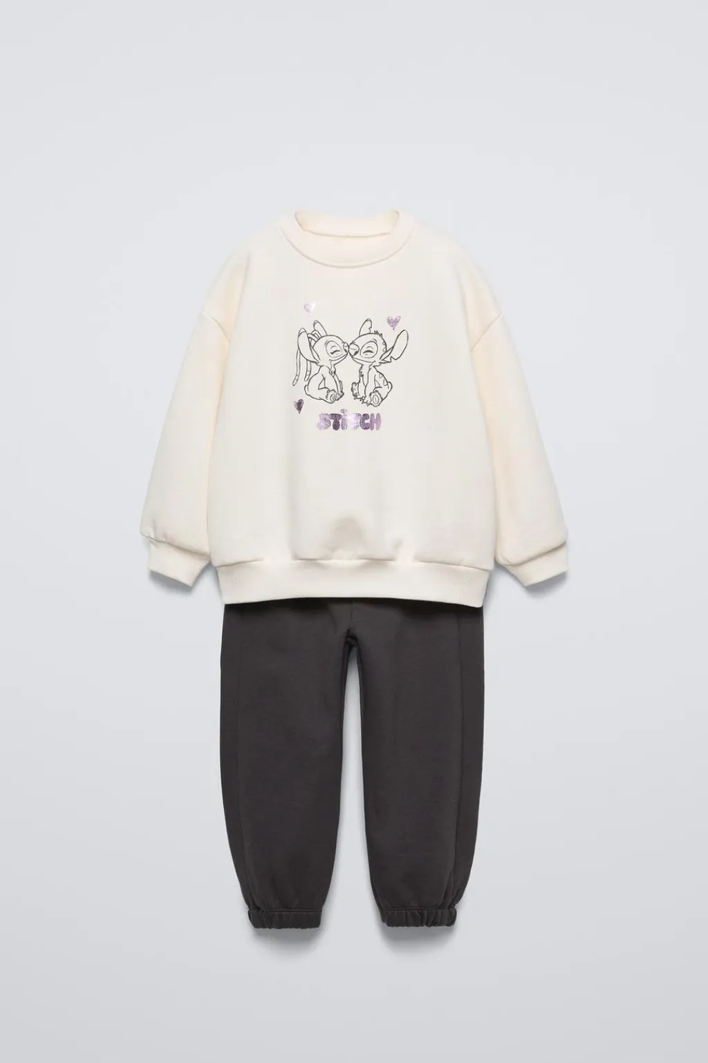 Conjunto dos piezas. Sudadera con cuello redondo y manga larga. Acabados en rib. Pantalón tipo jogger con cinturilla elástica. Bajo acabado en goma. Estampado LILO & STITCH © DISNEY con detalle brillo.