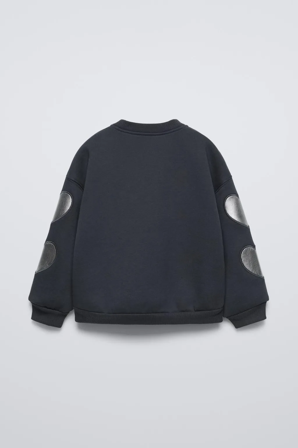 Sudadera con cuello redondo y manga larga. Acabados en rib. Aplique corazones con brillo. Calidad interior cálida y suave.