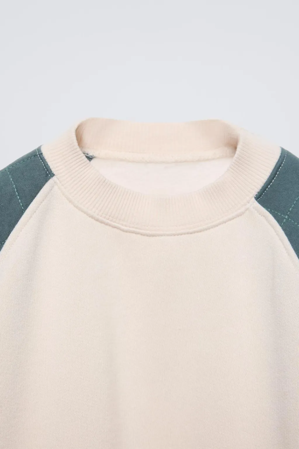 Sudadera con cuello redondo y manga larga acolchada combinada. Acabados en rib. Detalle texto bordado en bajo. Calidad interior cálida y suave.