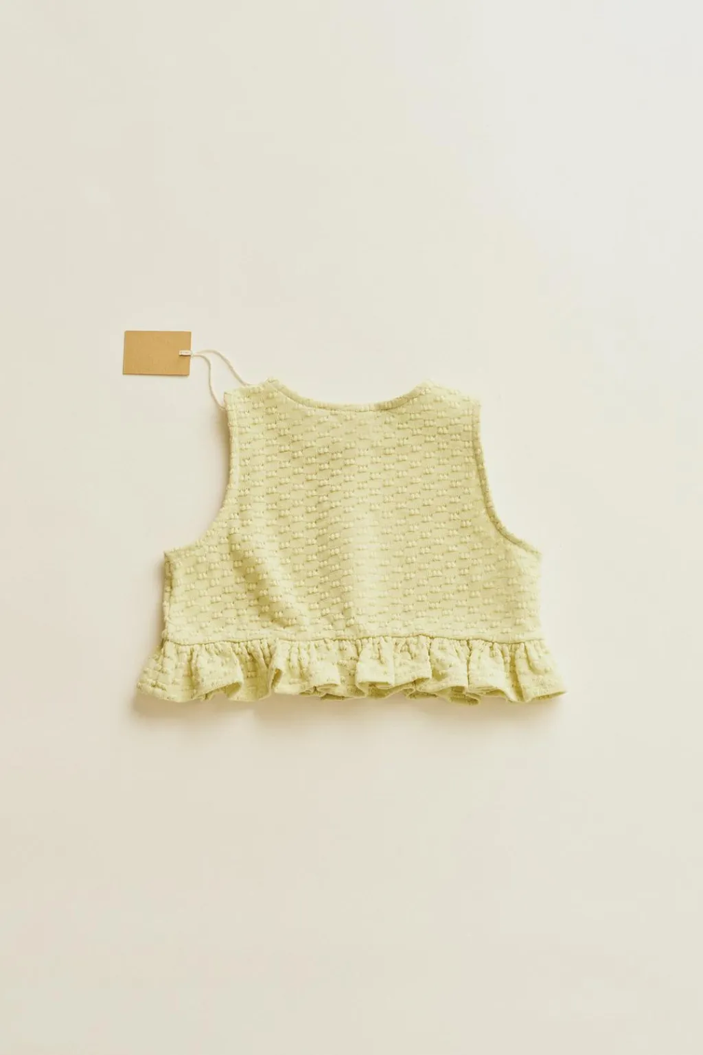 Top en un tejido de punto «pop corn» con algodón. Tiene unos botones de madera como cierre. El detalle está en el volante del bajo.