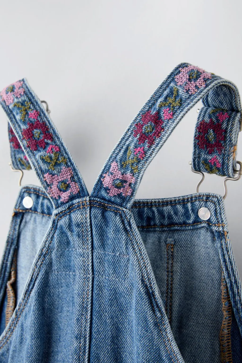 Peto con cuello recto y tirantes ajustables con jardineras y motivos bordados. Bolsillos en delantero y tipo plastrón en pechera y espalda. Cierres con botones en laterales.