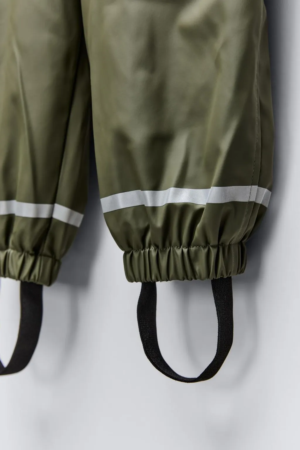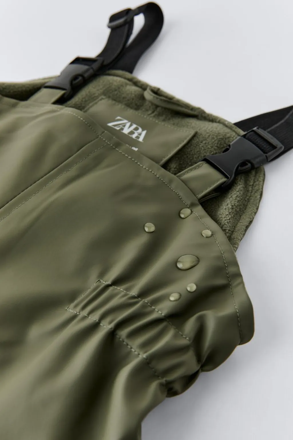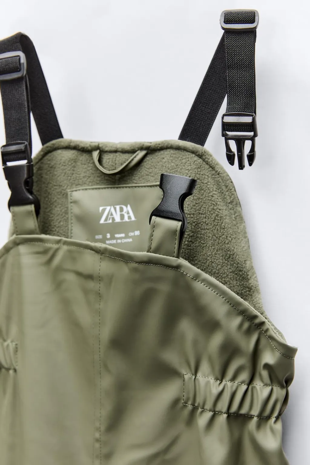 Peto engomado con cuello recto y tirantes ajustables elásticos. Detalle goma en cintura. Aplique cintas elásticas en bajo. Forro interior en tejido polar.