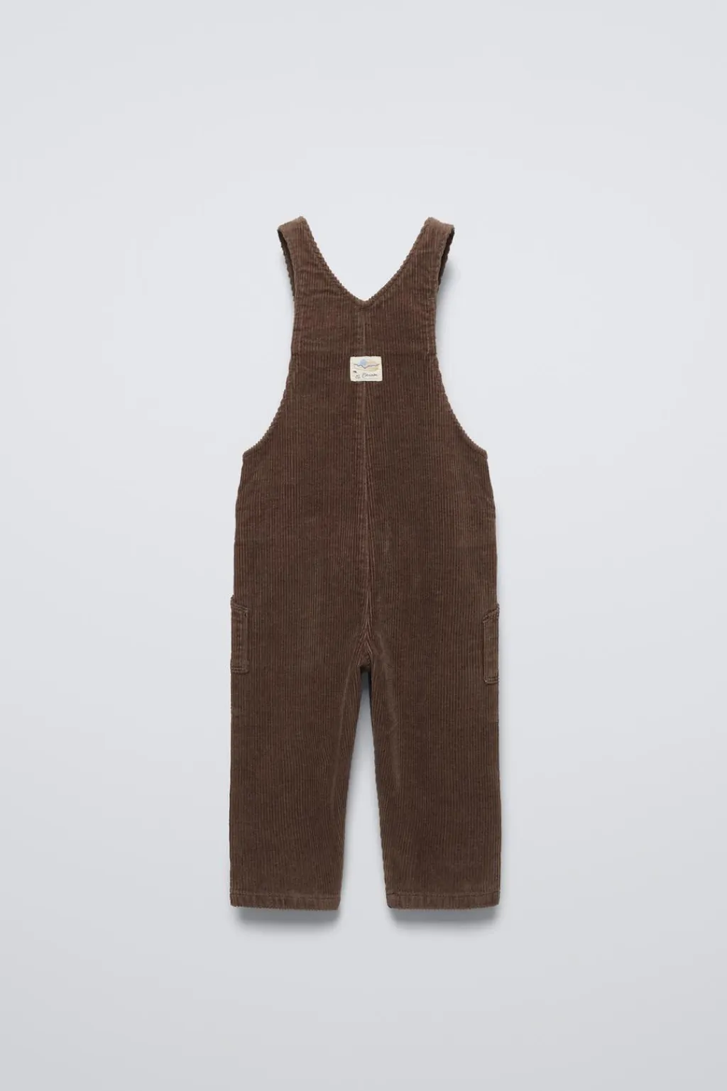 Peto largo de pana con cuello recto y tirantes ajustables por cierre botón frontal. Cierre botonadura en laterales. Bolsillos de tipo plastrón en delantero.