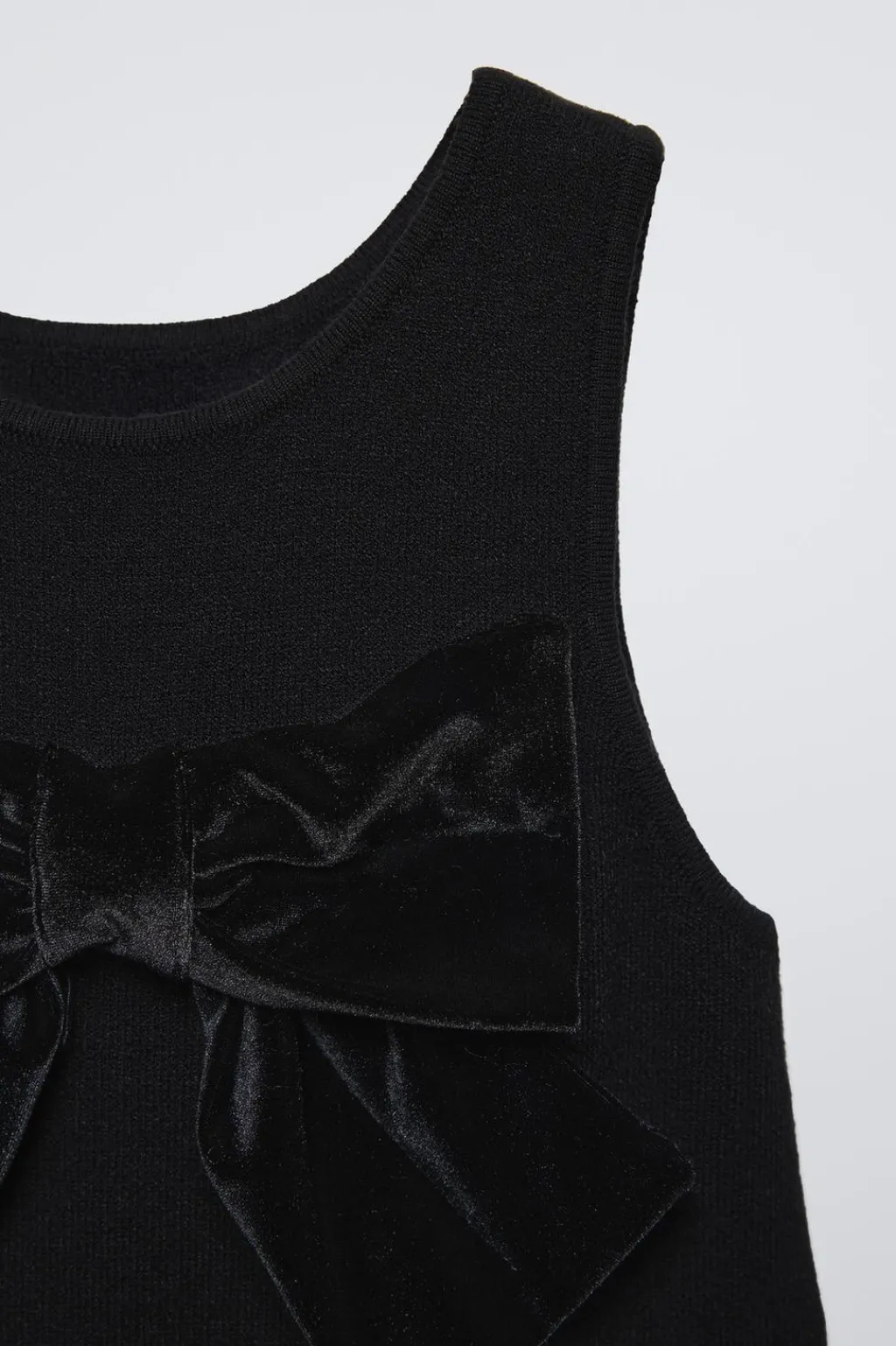 Vestido de punto con cuello redondo y manga sisa. Aplique lazo velvet en delantero.