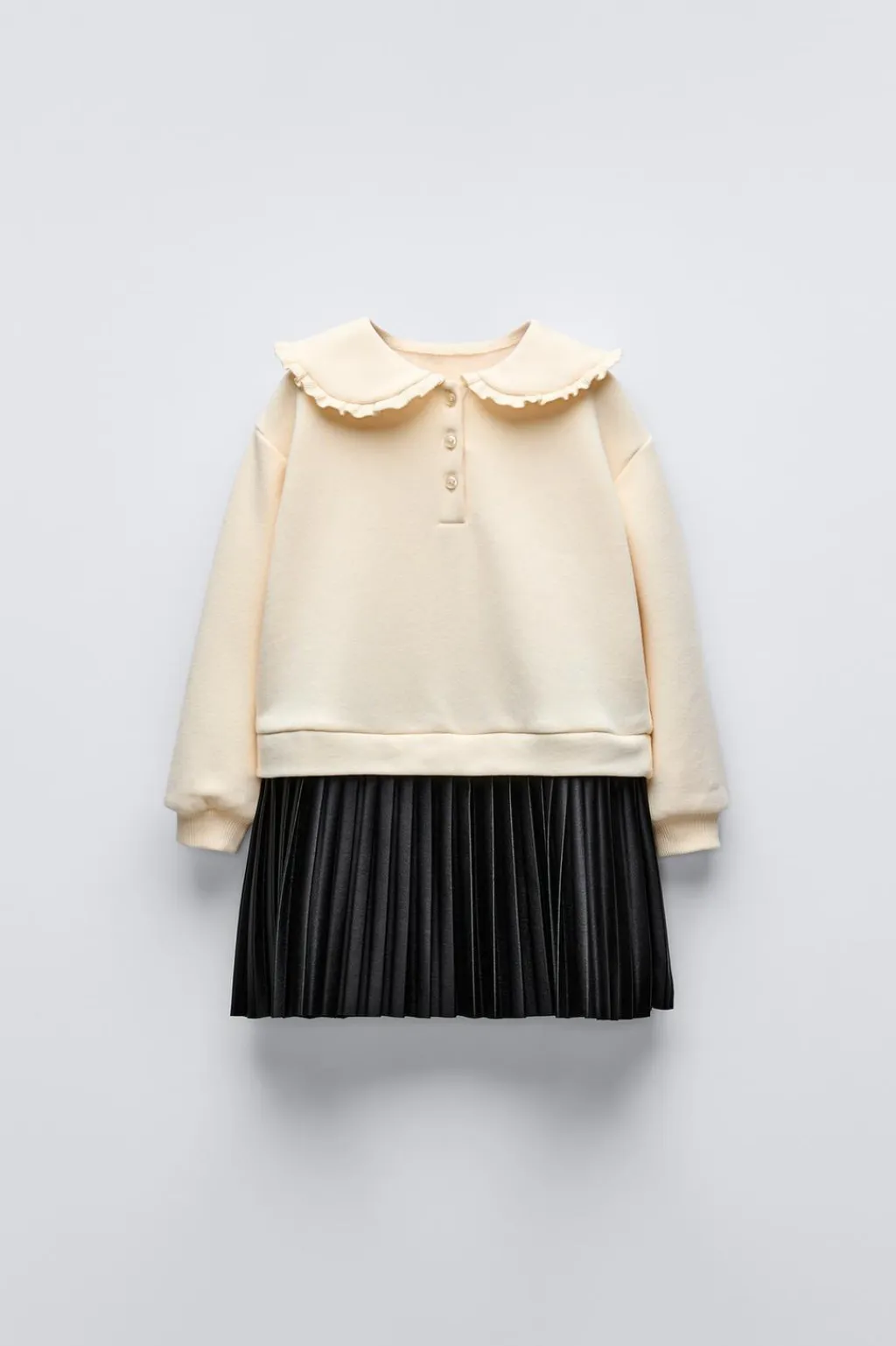 Vestido con cuello bobo y manga larga. Cierre con botones en canesú. Calidad interior cálida y suave. Falda en tejido efecto piel plisado.
