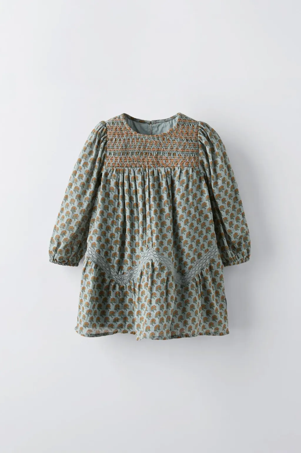 Vestido con cuello redondo y manga larga acabada en goma. Detalle bordado nido de abeja en pechera. Cierre tipo lágrima con botones en espalda.