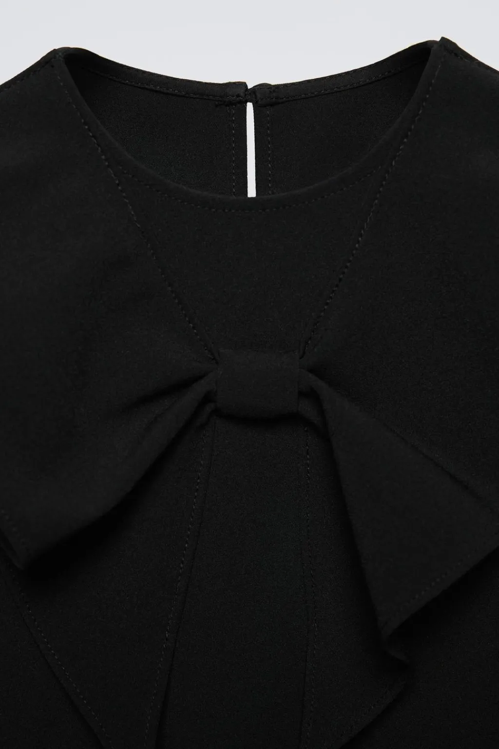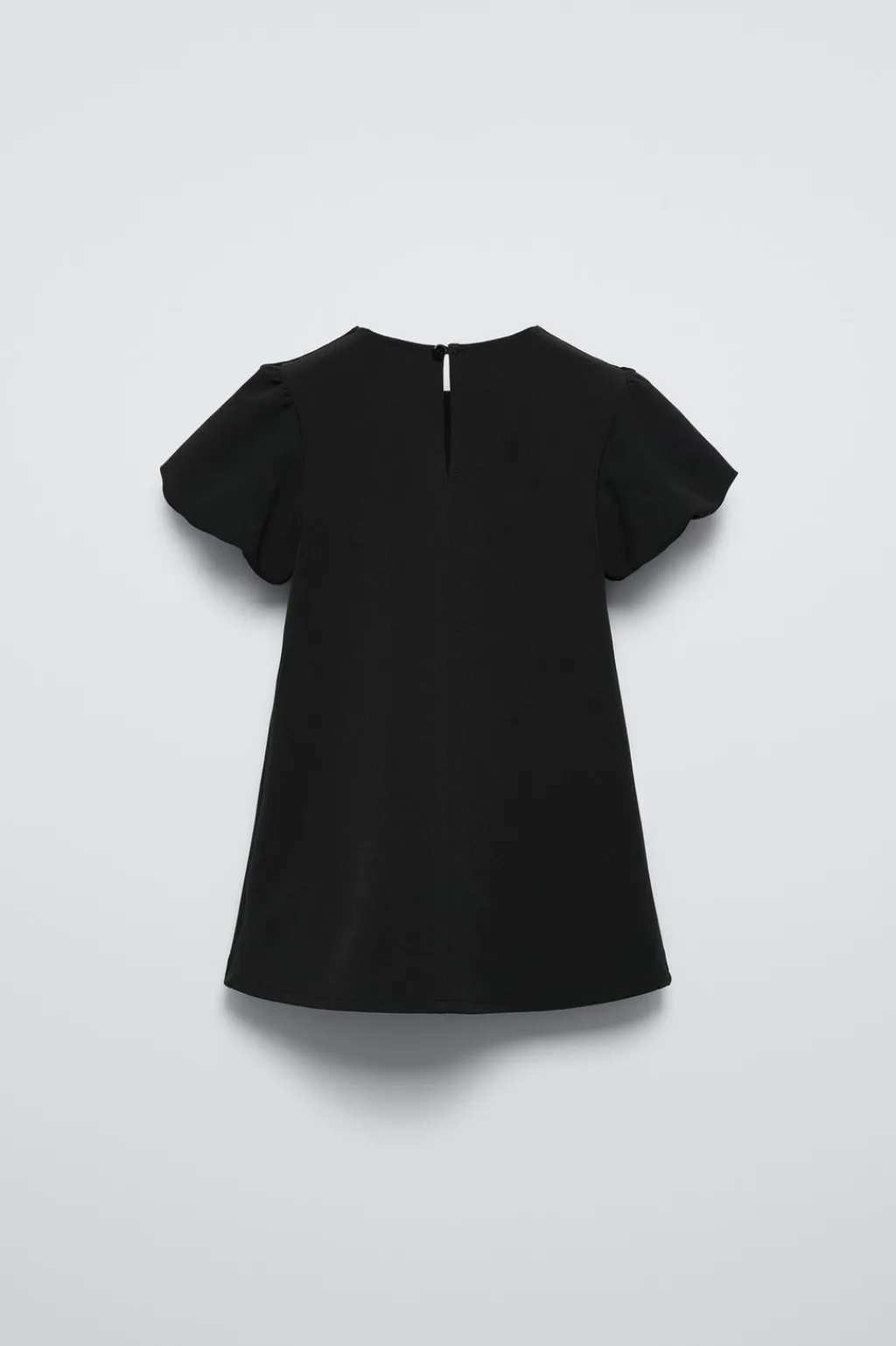 Vestido con cuello redondo y manga corta acabada en globo. Cierre tipo lágrima con botón en espalda. Aplique lazo en pechera.