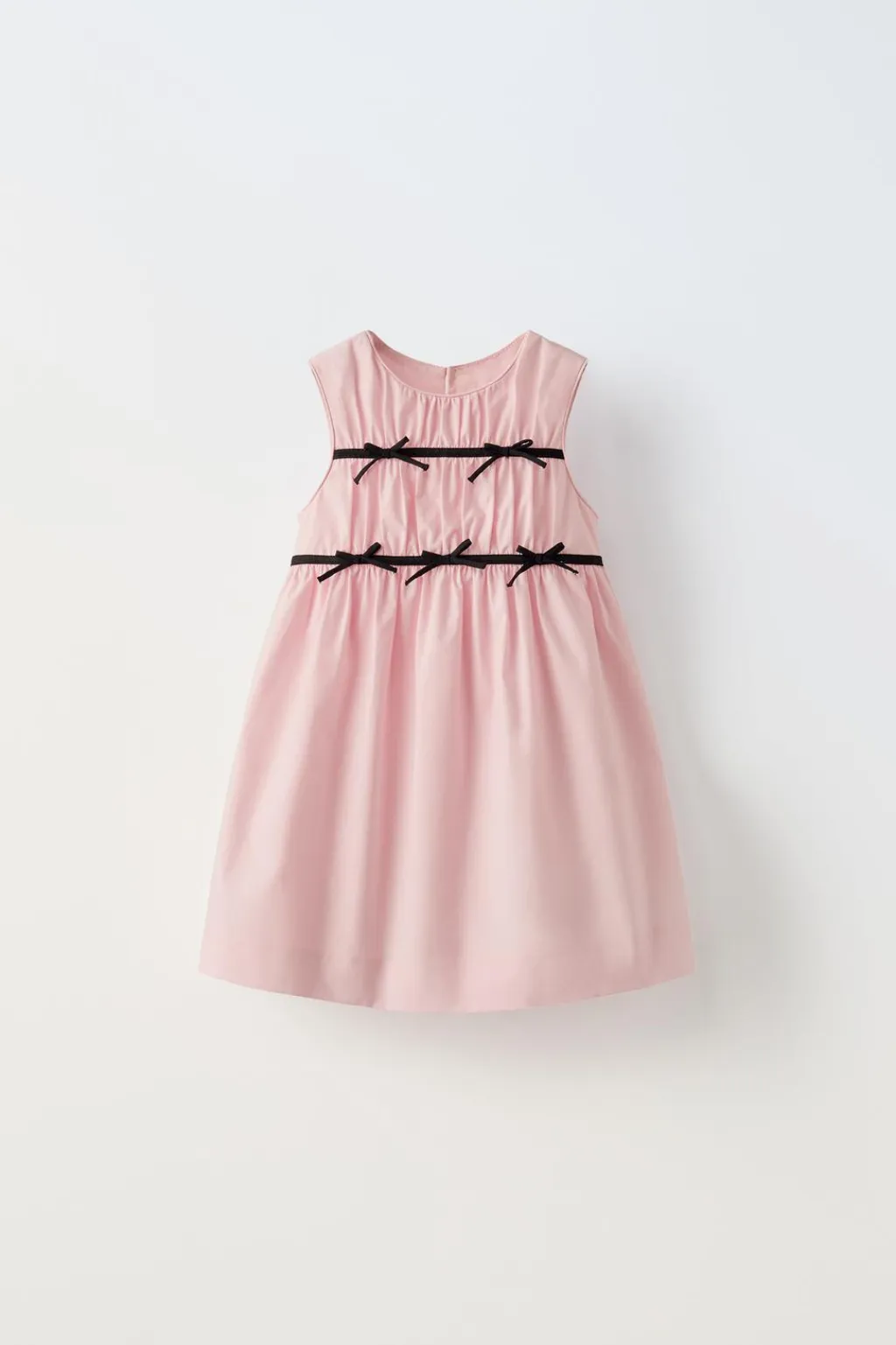 Vestido con cuello redondo y manga sisa. Aplique lazos color a contraste y frunces en delantero. Cierre con botón en espalda.