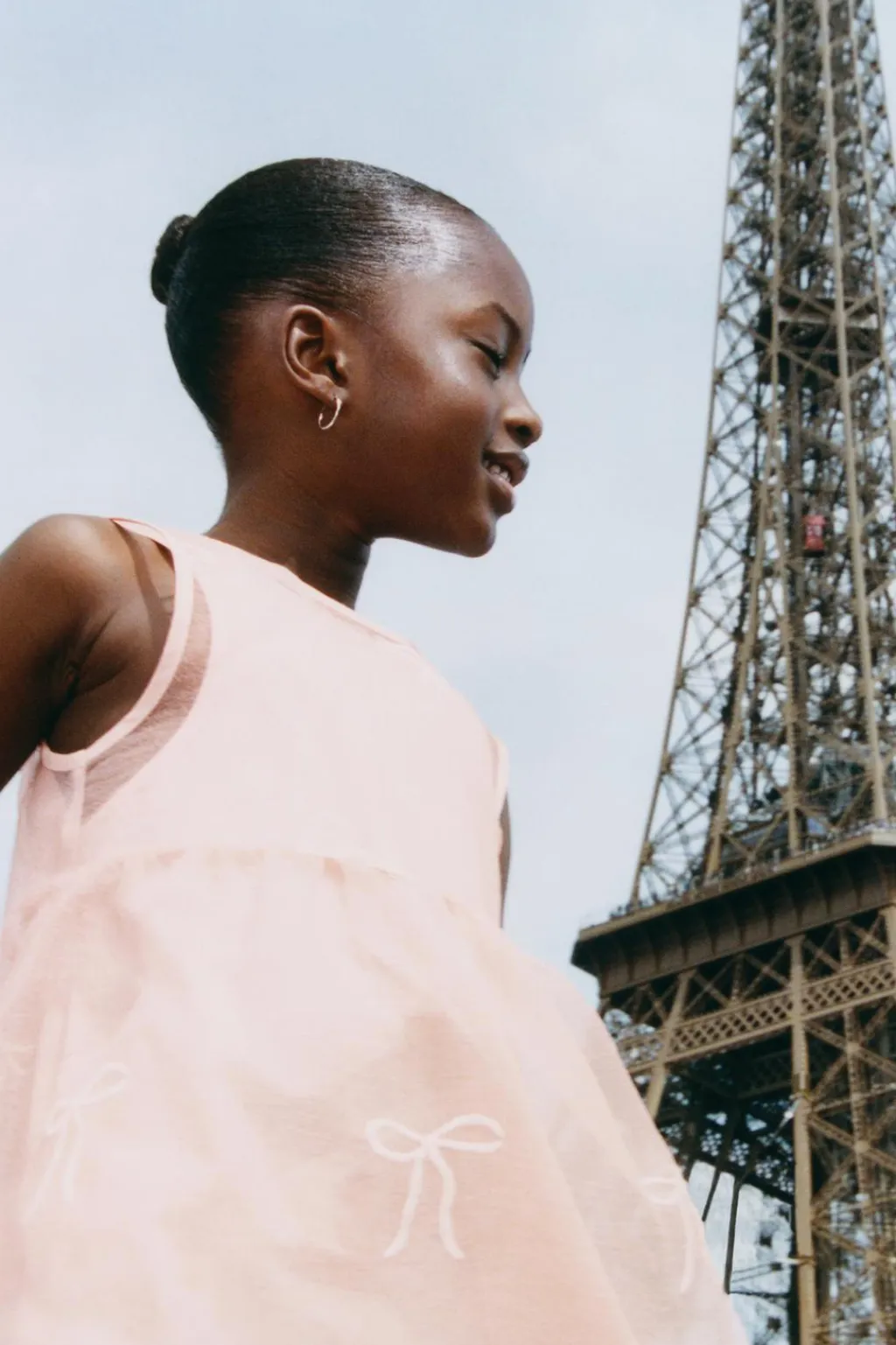 Vestido con cuello redondo y sin mangas. Cierre tipo lágrima con botón en espalda. Motivo lazos bordado.
