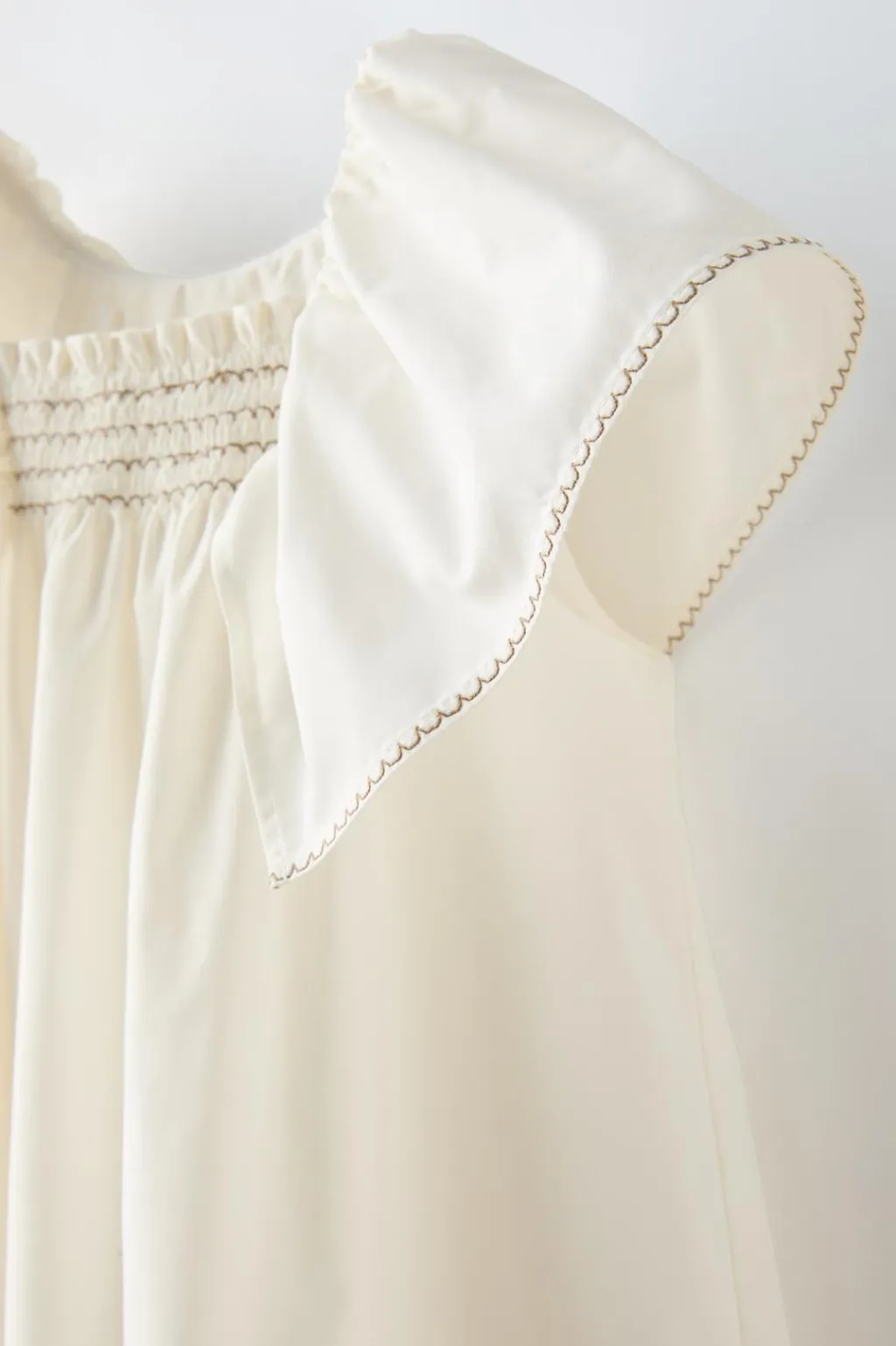 Vestido con cuello recto con aplique gomas. Detalle maxi volante en mangas. Bordados color contraste en cuello y volantes.