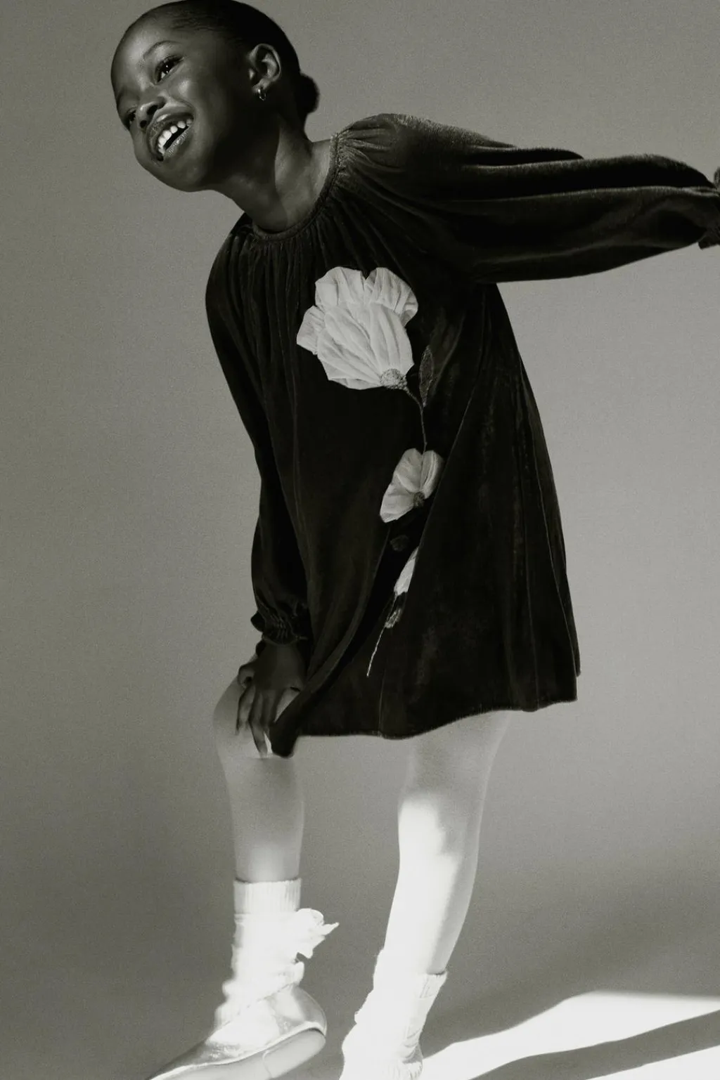Vestido con cuello redondo y manga larga acabada en goma. Cierre tipo lágrima con botón en espalda. Aplique flores en delantero.