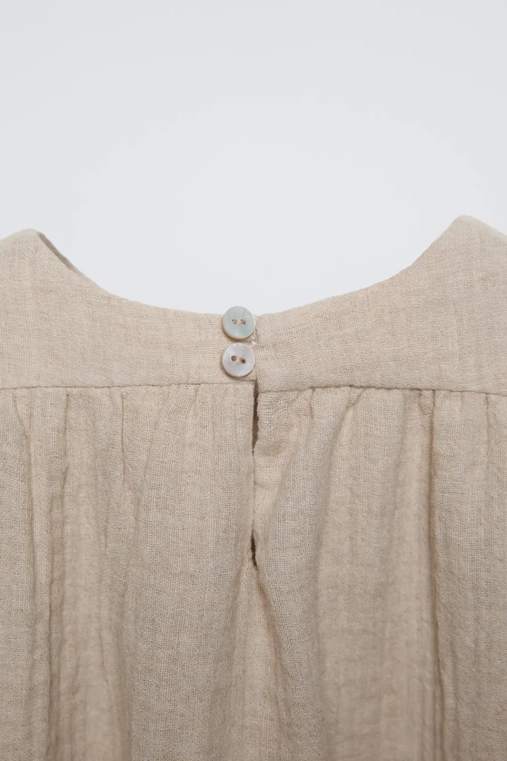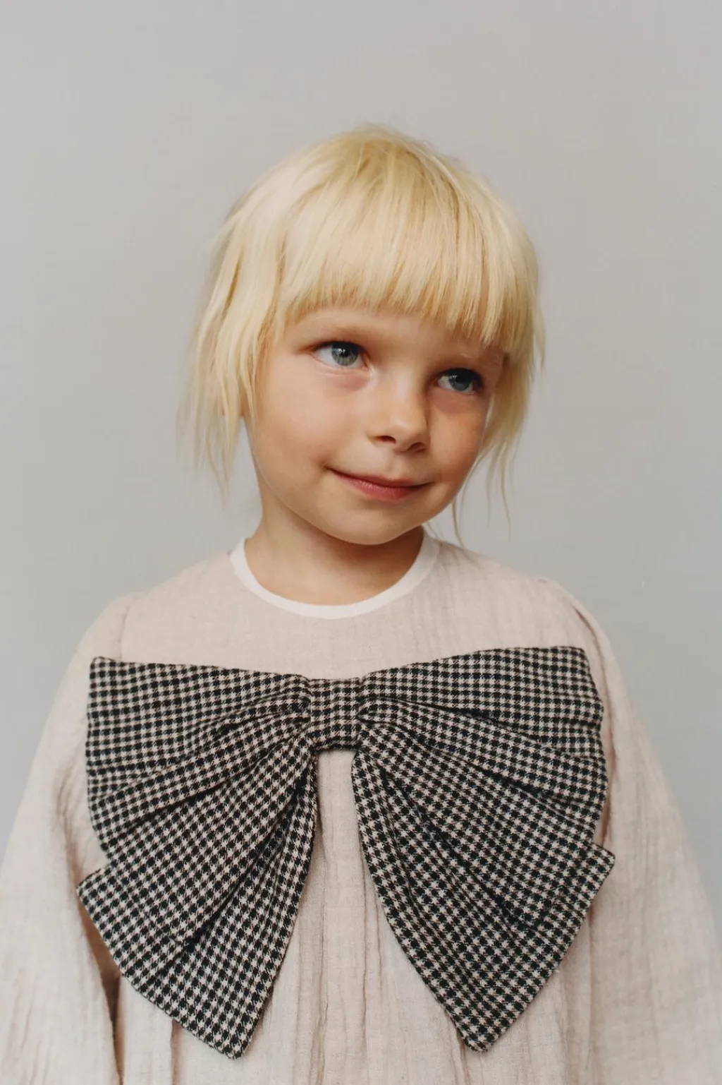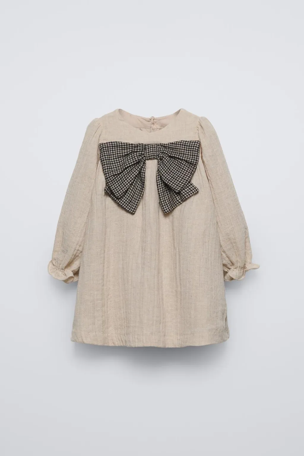 Vestido con cuello redondo y manga larga acabadas en goma. Cierre botones en espalda. Aplique lazo en delantero.