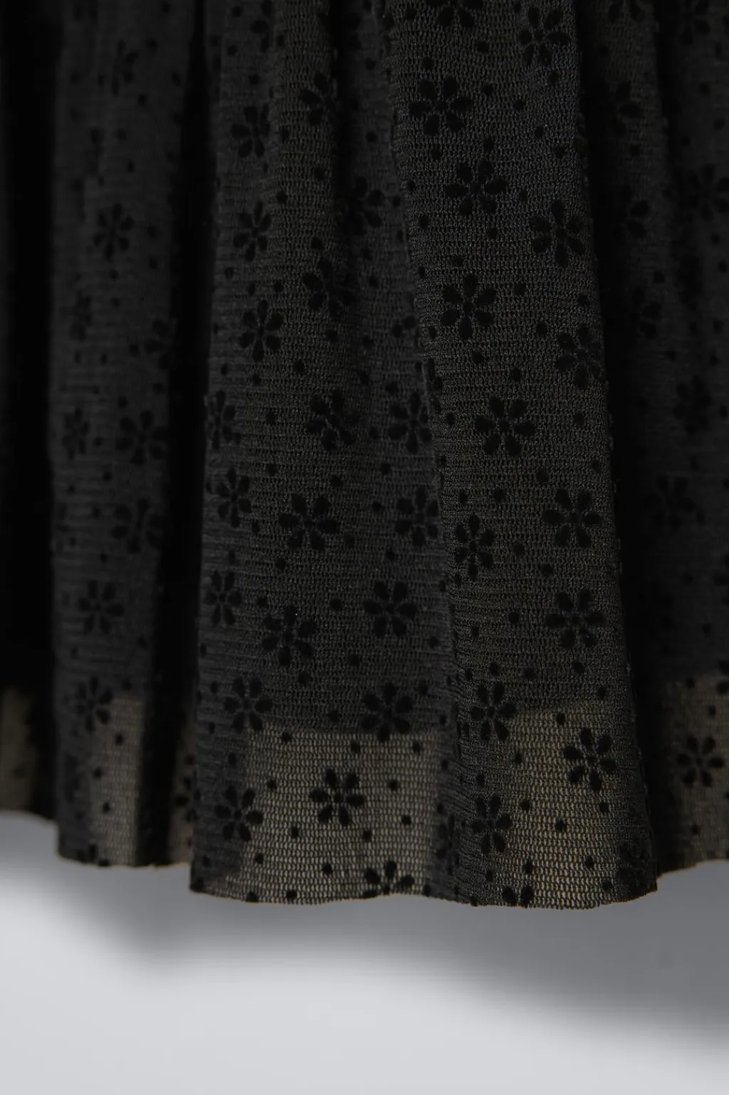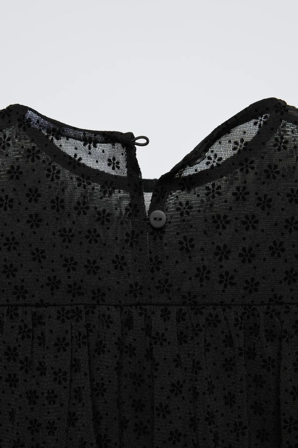 Vestido con cuello redondo y manga larga acabada en goma. Cierre tipo lágrima con botón en espalda. Detalle flores con flock. Forro interior combinado a tono.