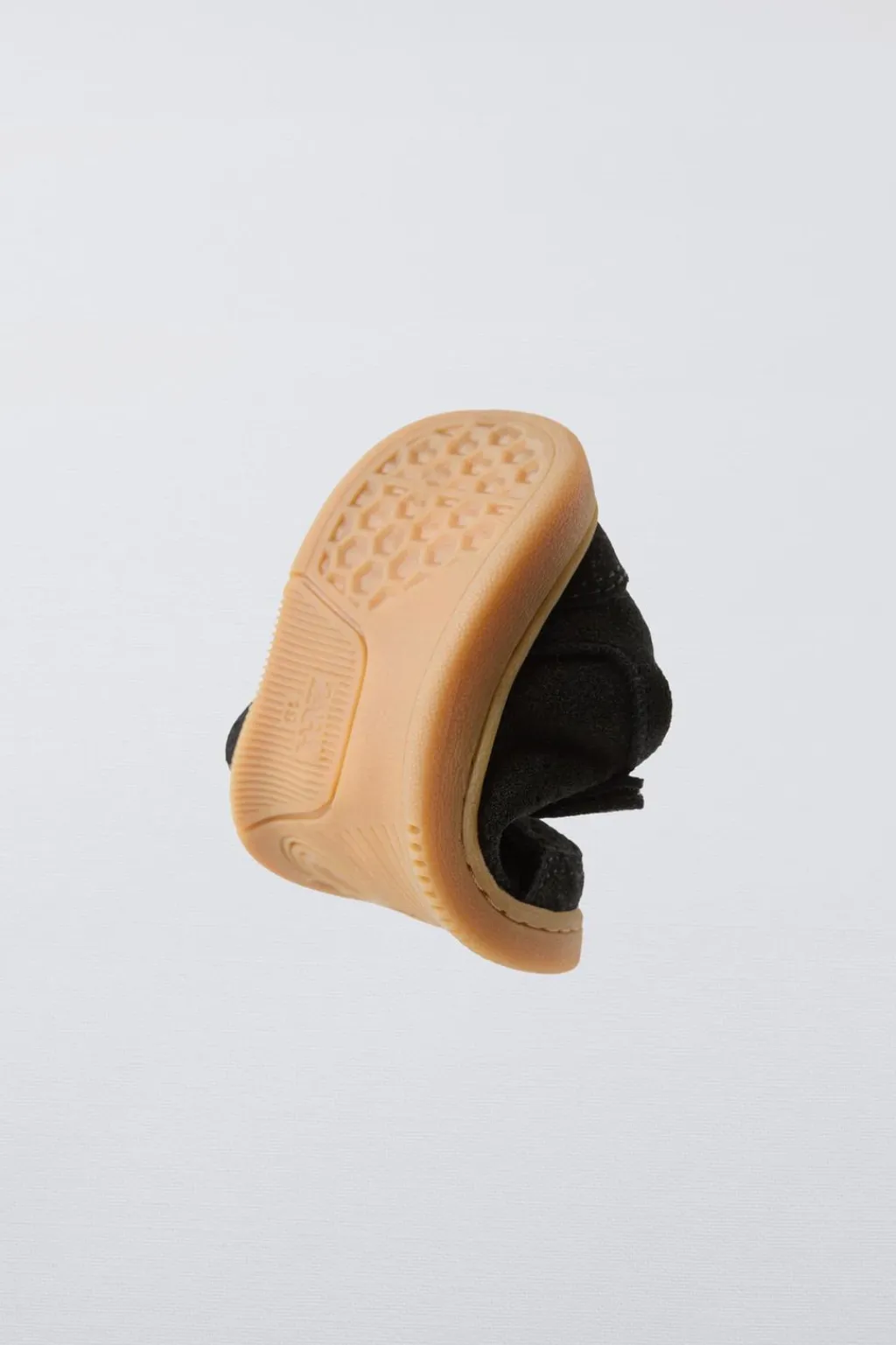 Zapatilla tipo bamba 100% piel vacuno. Suela ancha con espacio para los dedos, flexible y totalmente plana. Cierre regulable mediante cordones elásticos y tira adherente. Plantilla flexible. Suela de goma en contraste de color.